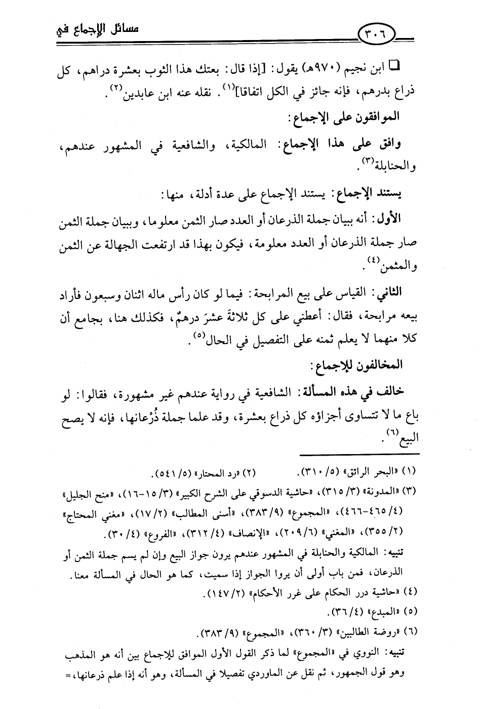 • ابن نجيم (970 هـ) يقول: [إذا قال: بعتك هذا الثوب بعشرة دراهم، كل ذراع بدرهم، فإنه جائز في الكل اتفاقا] (¬1). نقله عنه ابن عابدين (¬2).
