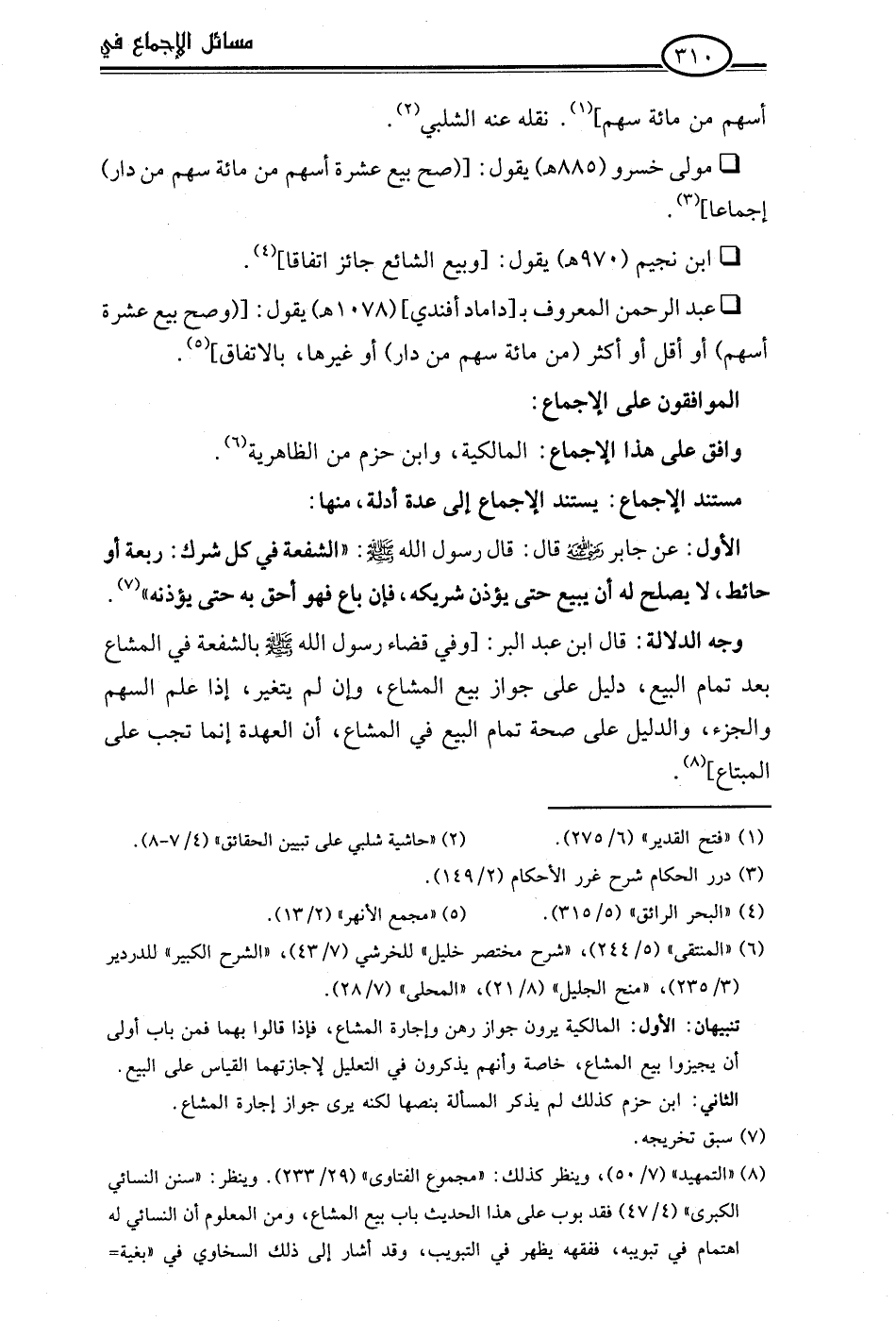 • عبد الرحمن المعروف بـ[داماد أفندي] (1078 هـ) يقول: [(وصح بيع عشرة أسهم) أو أقل أو أكثر (من مائة سهم من دار) أو غيرها، بالاتفاق] (¬5).