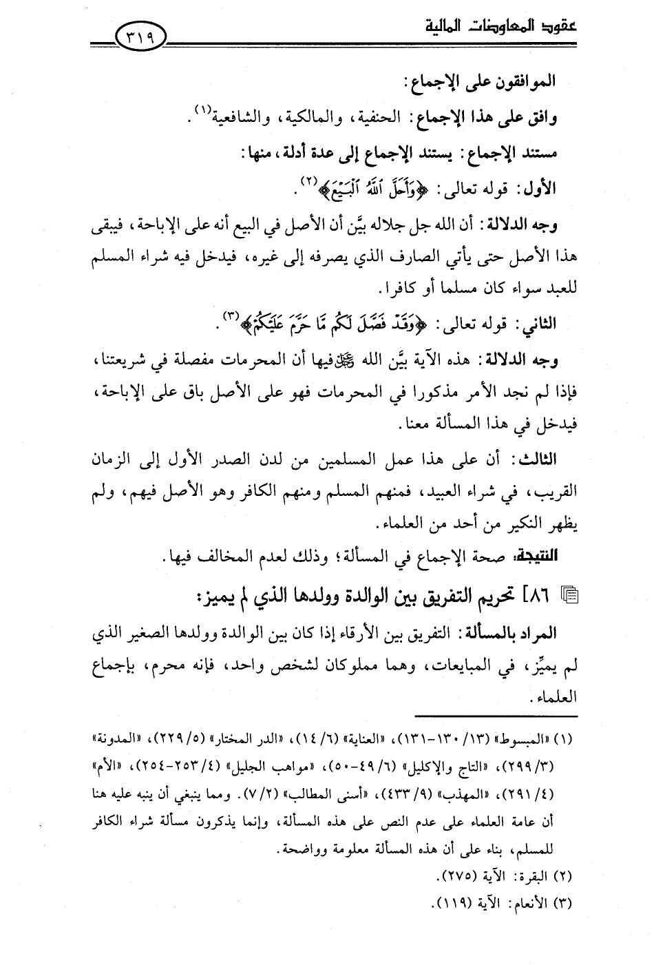 • المراد بالمسألة: التفريق بين الأرقاء إذا كان بين الوالدة وولدها الصغير الذي لم يميِّز، في المبايعات، وهما مملوكان لشخص واحد، فإنه محرم، بإجماع العلماء.
