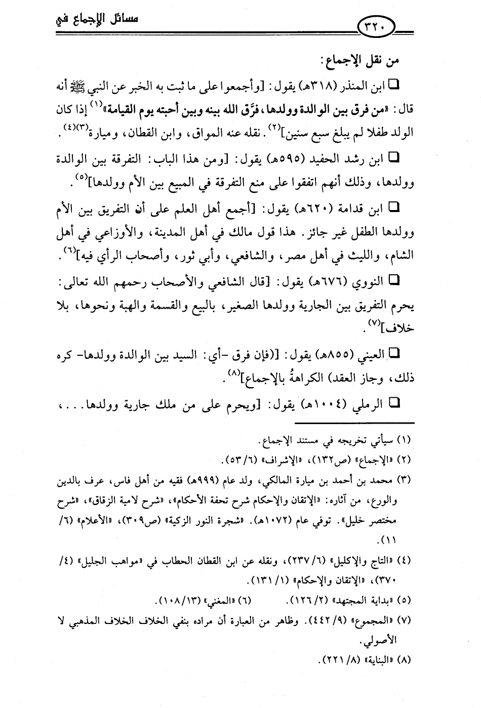 • ابن المنذر (318 هـ) يقول: [وأجمعوا على ما ثبت به الخبر عن النبي -صلى اللَّه عليه وسلم- أنه قال: "من فرق بين الوالدة وولدها، فرَّق اللَّه بينه وبين أحبته يوم القيامة" (¬1) إذا كان الولد طفلا لم يبلغ سبع سنين] (¬2). نقله عنه المواق، وابن القطان، وميارة (¬3) (¬4).