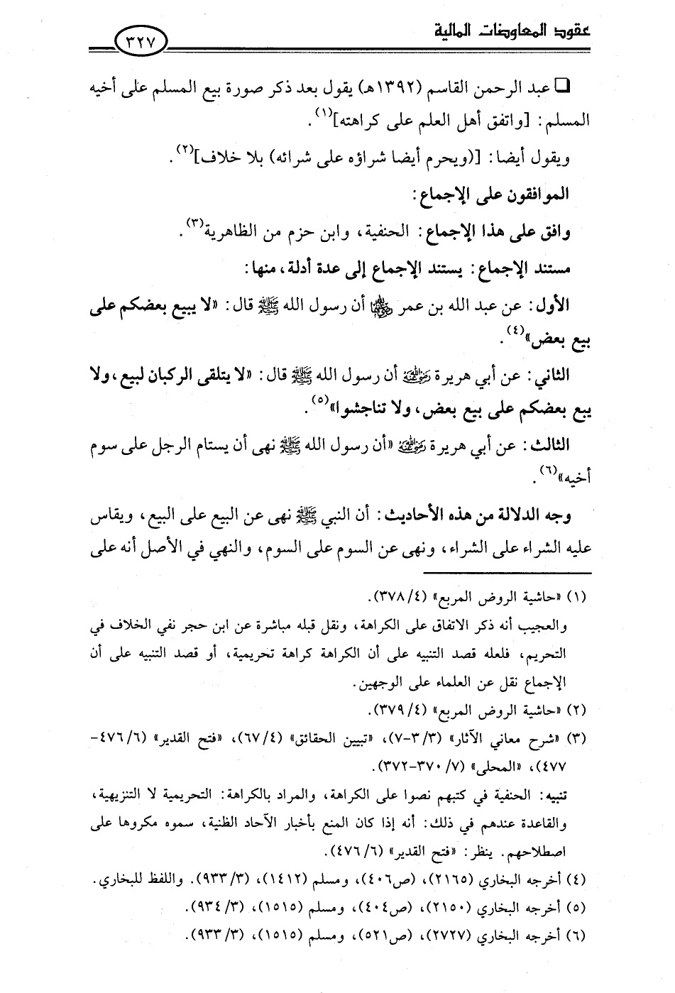 • عبد الرحمن القاسم (1392 هـ) يقول بعد ذكر صورة بيع المسلم على أخيه المسلم: [واتفق أهل العلم على كراهته] (¬1).