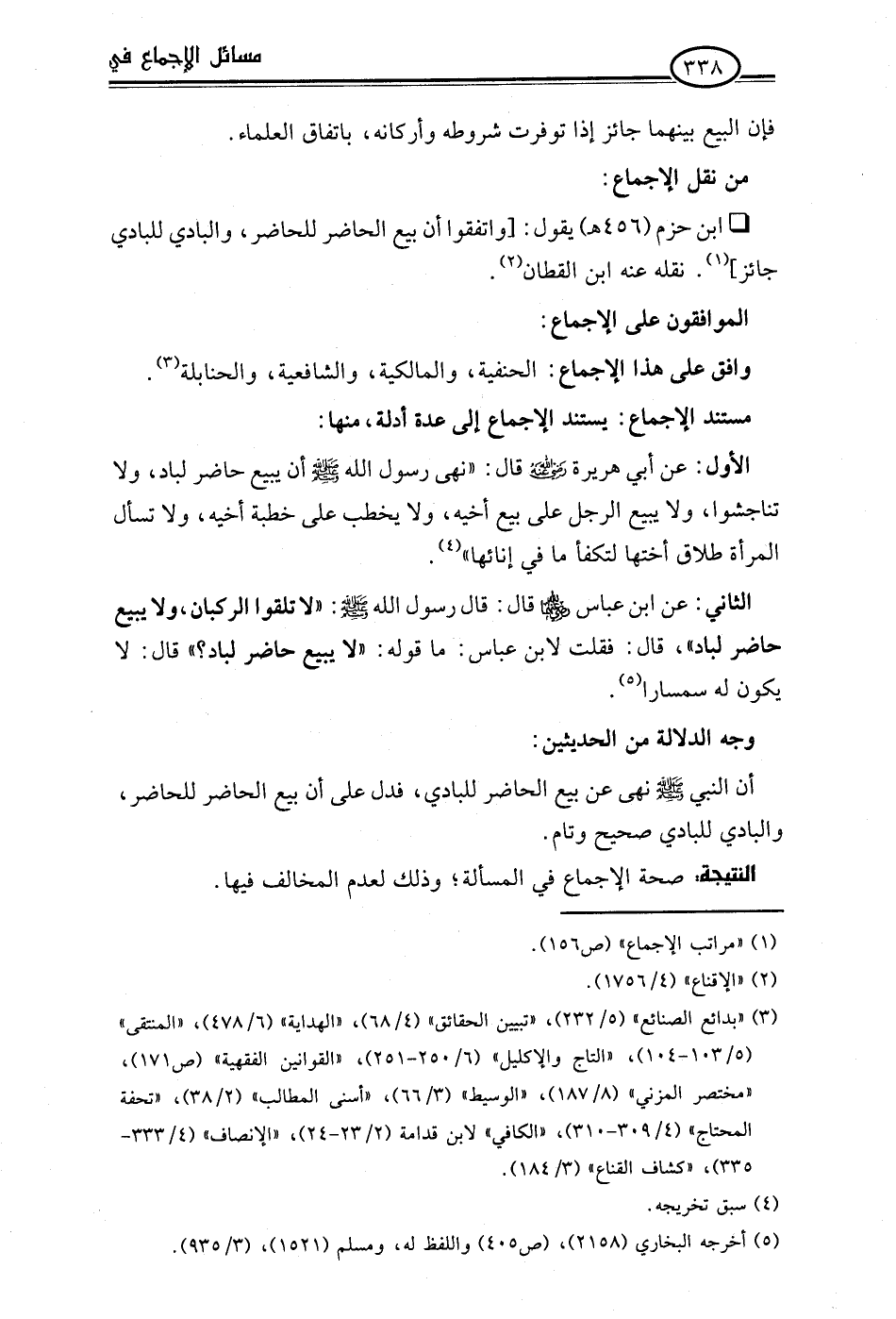 • ابن حزم (456 هـ) يقول: [اتفقوا أن بيع الحاضر للحاضر، والبادي للبادي جائز] (¬1). نقله عنه ابن القطان (¬2).