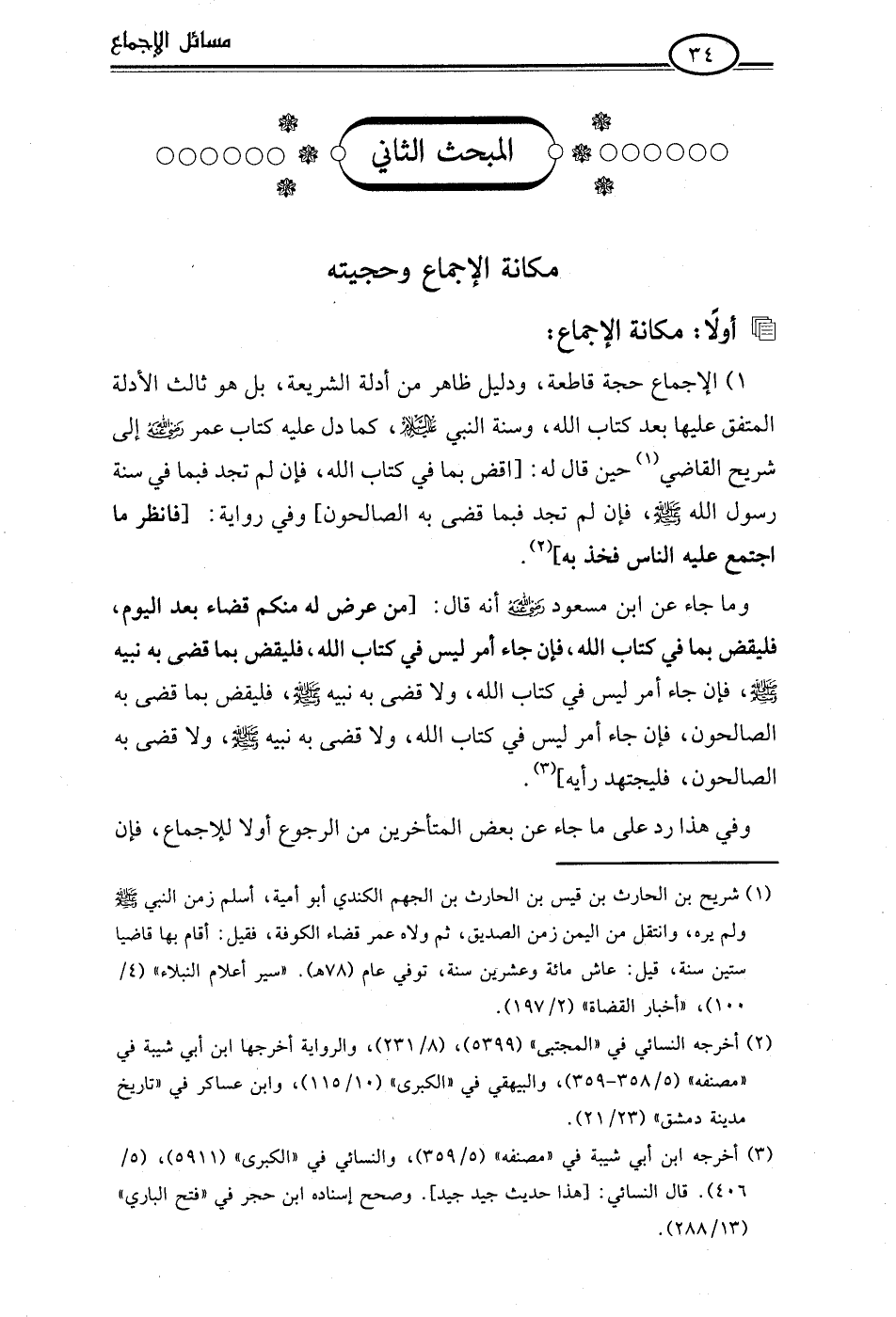وما جاء عن ابن مسعود -رضي اللَّه عنه- أنه قال: [من عرض له منكم قضاء بعد اليوم، فليقض بما في كتاب اللَّه، فإن جاء أمر ليس في كتاب اللَّه، فليقض بما قضى به نبيه -صلى اللَّه عليه وسلم-، فإن جاء أمر ليس في كتاب اللَّه، ولا قضى به نبيه -صلى اللَّه عليه وسلم-، فليقض بما قضى به الصالحون، فإن جاء أمر ليس في كتاب اللَّه، ولا قضى به نبيه -صلى اللَّه عليه وسلم-، ولا قضى به الصالحون، فليجتهد رأيه] (¬3).