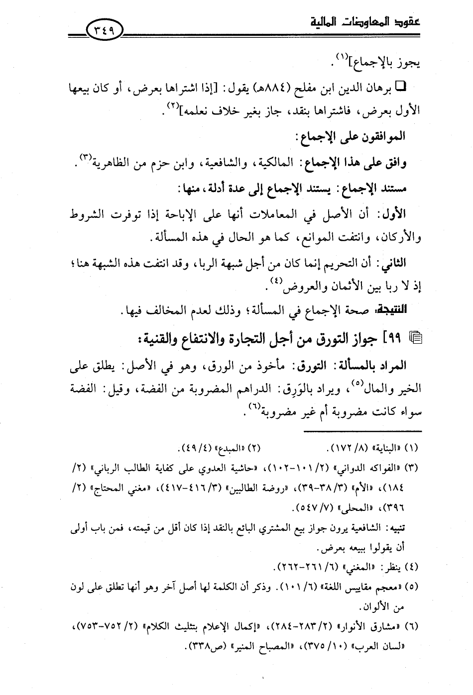 • برهان الدين ابن مفلح (884 هـ) يقول: [إذا اشتراها بعرض، أو كان بيعها الأول بعرض، فاشتراها بنقد، جاز بغير خلاف نعلمه] (¬2).