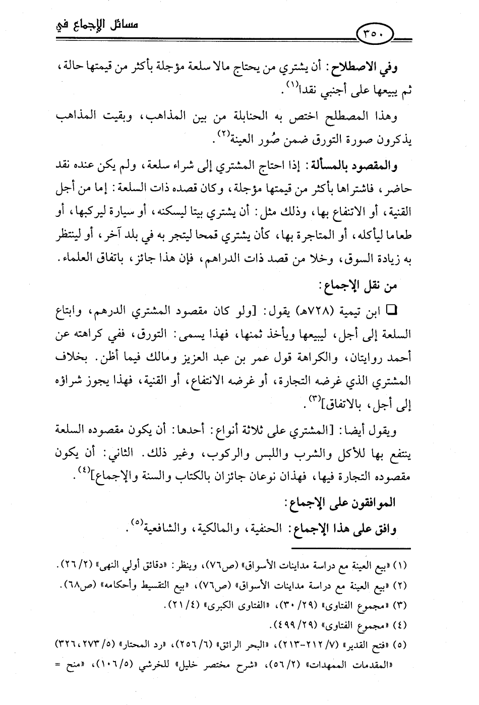 • ابن تيمية (728 هـ) يقول: [ولو كان مقصود المشتري الدرهم، وابتاع السلعة إلى أجل، ليبيعها ويأخذ ثمنها، فهذا يسمى: التورق، ففي كراهته عن أحمد روايتان، والكراهة قول عمر بن عبد العزيز ومالك فيما أظن. بخلاف المشتري الذي غرضه التجارة، أو غرضه الانتفاع، أو القنية، فهذا يجوز شراؤه إلى أجل، بالاتفاق] (¬3).