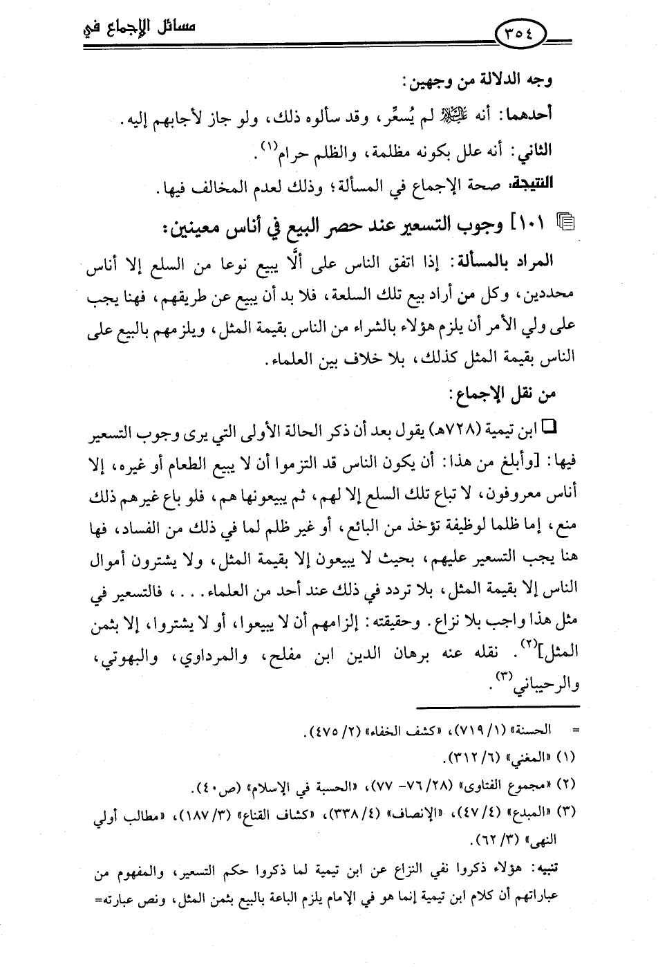 تنبيه: هؤلاء ذكروا نفي النزاع عن ابن تيمية لما ذكروا حكم التسعير، والمفهوم من عباراتهم أن كلام ابن تيمية إنما هو في الإمام يلزم الباعة بالبيع بثمن المثل، ونص عبارته =