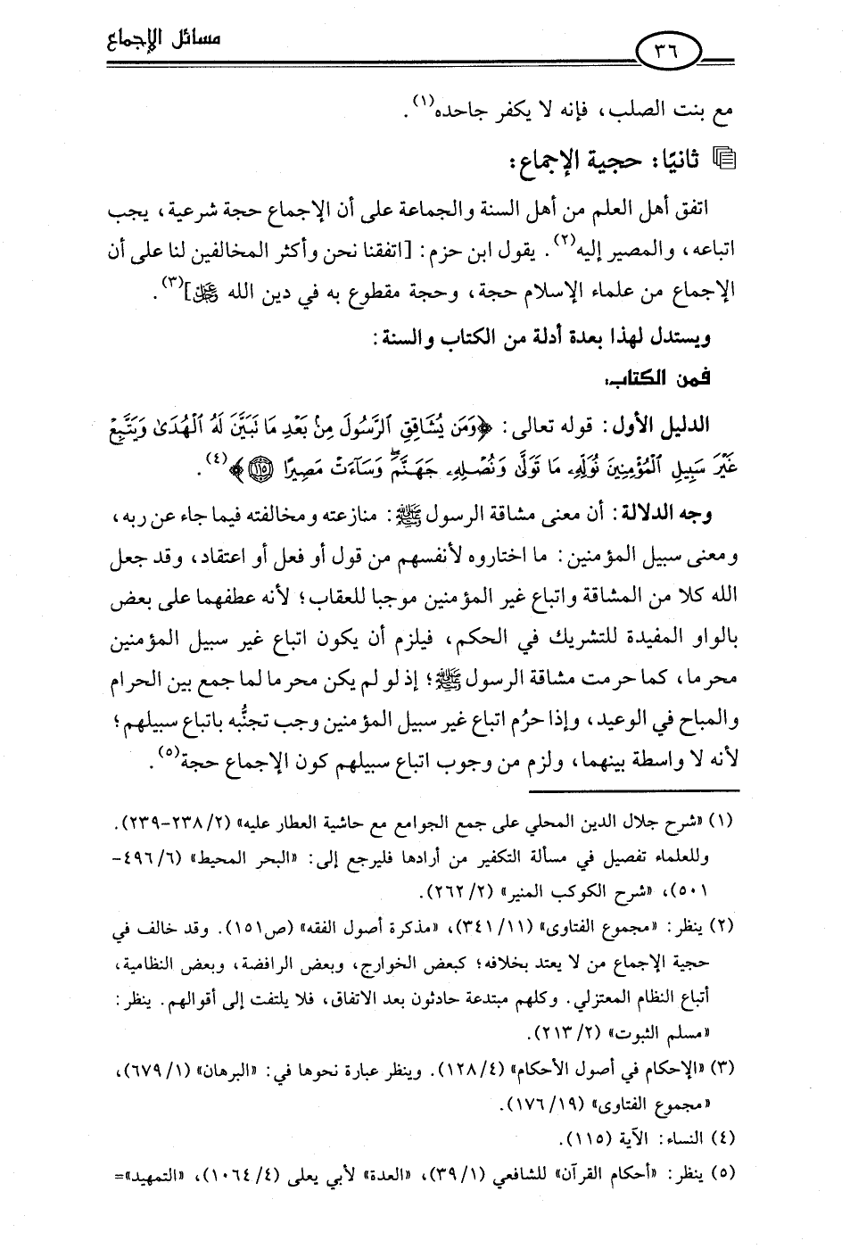 (¬2) ينظر: "مجموع الفتاوى" (11/ 341)، "مذكرة أصول الفقه" (ص 151). وقد خالف في حجية الإجماع من لا يعتد بخلافه؛ كبعض الخوارج، وبعض الرافضة، وبعض النظامية، أتباع النظام المعتزلي. وكلهم مبتدعة حادثون بعد الاتفاق، فلا يلتفت إلى أقوالهم. ينظر: "مسلم الثبوت" (2/ 213).