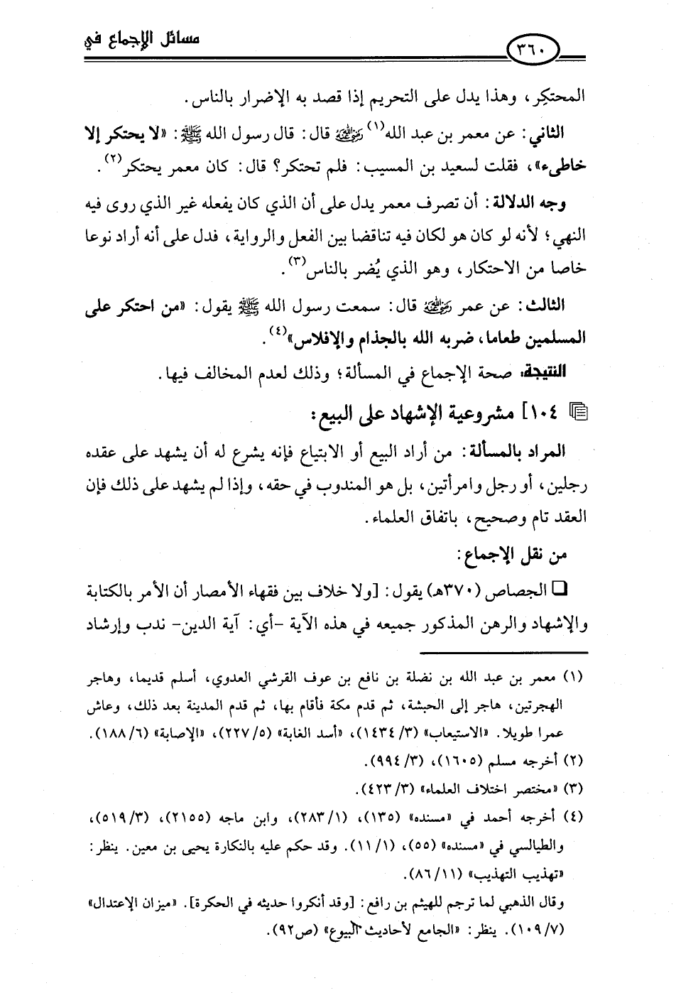 الثالث: عن عمر -رضي اللَّه عنه- قال: سمعت رسول اللَّه -صلى اللَّه عليه وسلم- يقول: "من احتكر على المسلمين طعاما، ضربه اللَّه بالجذام والإفلاس" (¬4).Rصحة الإجماع في المسألة؛ وذلك لعدم المخالف فيها.