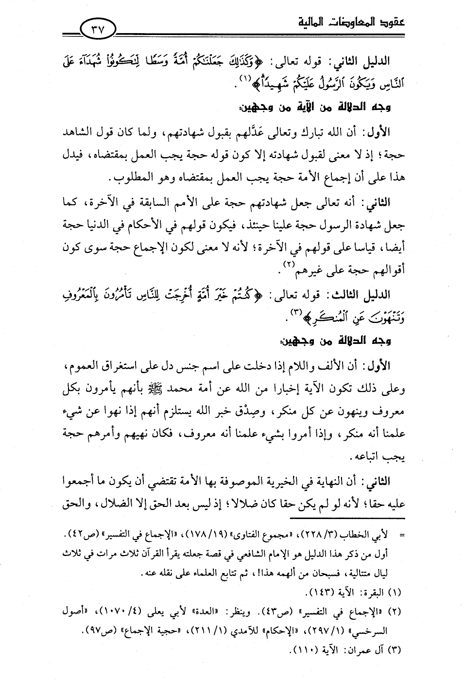 الأول: أن اللَّه تبارك وتعالى عَدَّلهم بقبول شهادتهم، ولما كان قول الشاهد حجة؛ إذ لا معنى لقبول شهادته إلا كون قوله حجة يجب العمل بمقتضاه، فيدل هذا على أن إجماع الأمة حجة يجب العمل بمقتضاه وهو المطلوب.