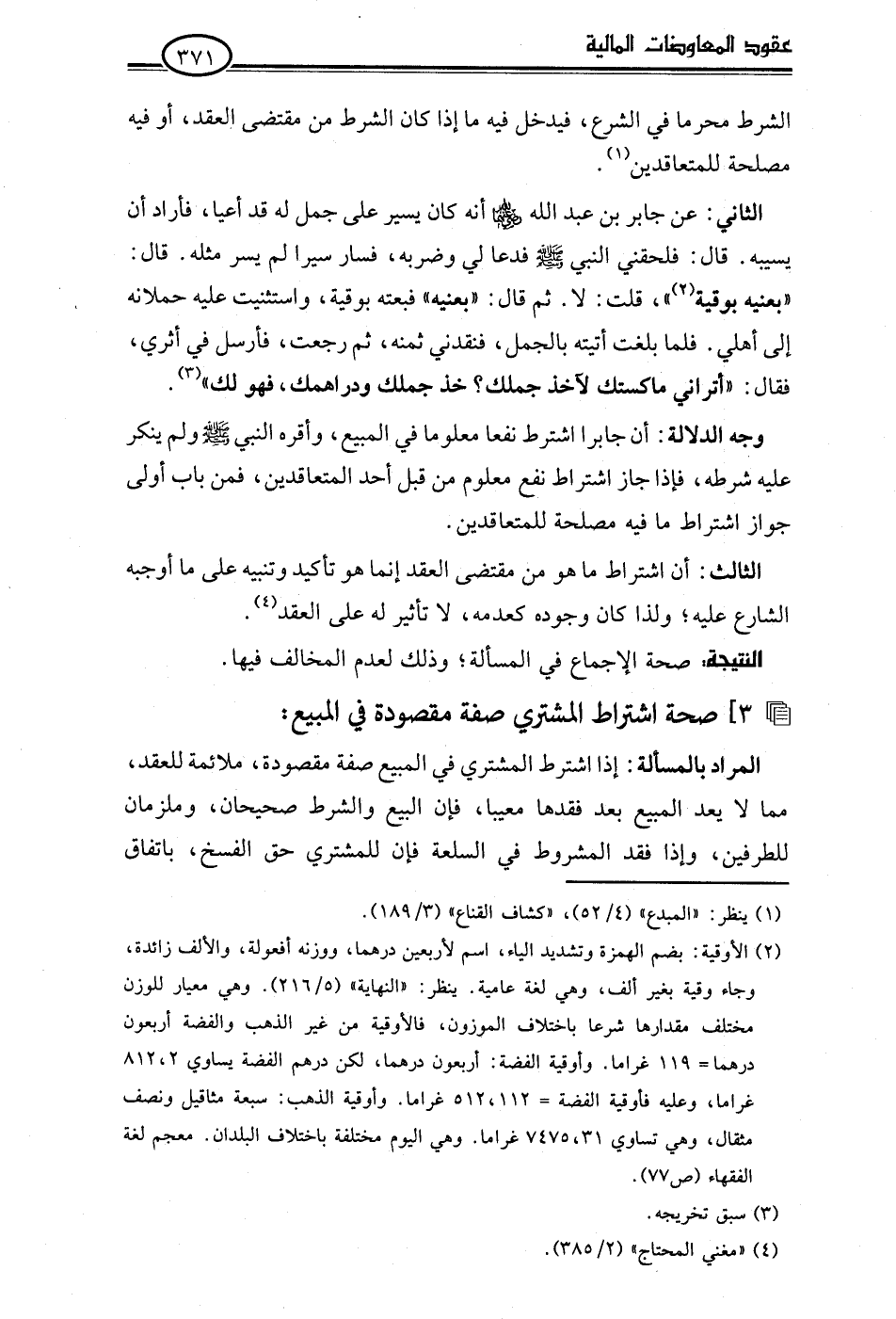 • وجه الدلالة: أن جابر اشترط نفعا معلوما في المبيع، وأقره النبي -صلى اللَّه عليه وسلم- ولم ينكر عليه شرطه، فإذا جاز اشتراط نفع معلوم من قبل أحد المتعاقدين، فمن باب أولى جواز اشتراط ما فيه مصلحة للمتعاقدين.