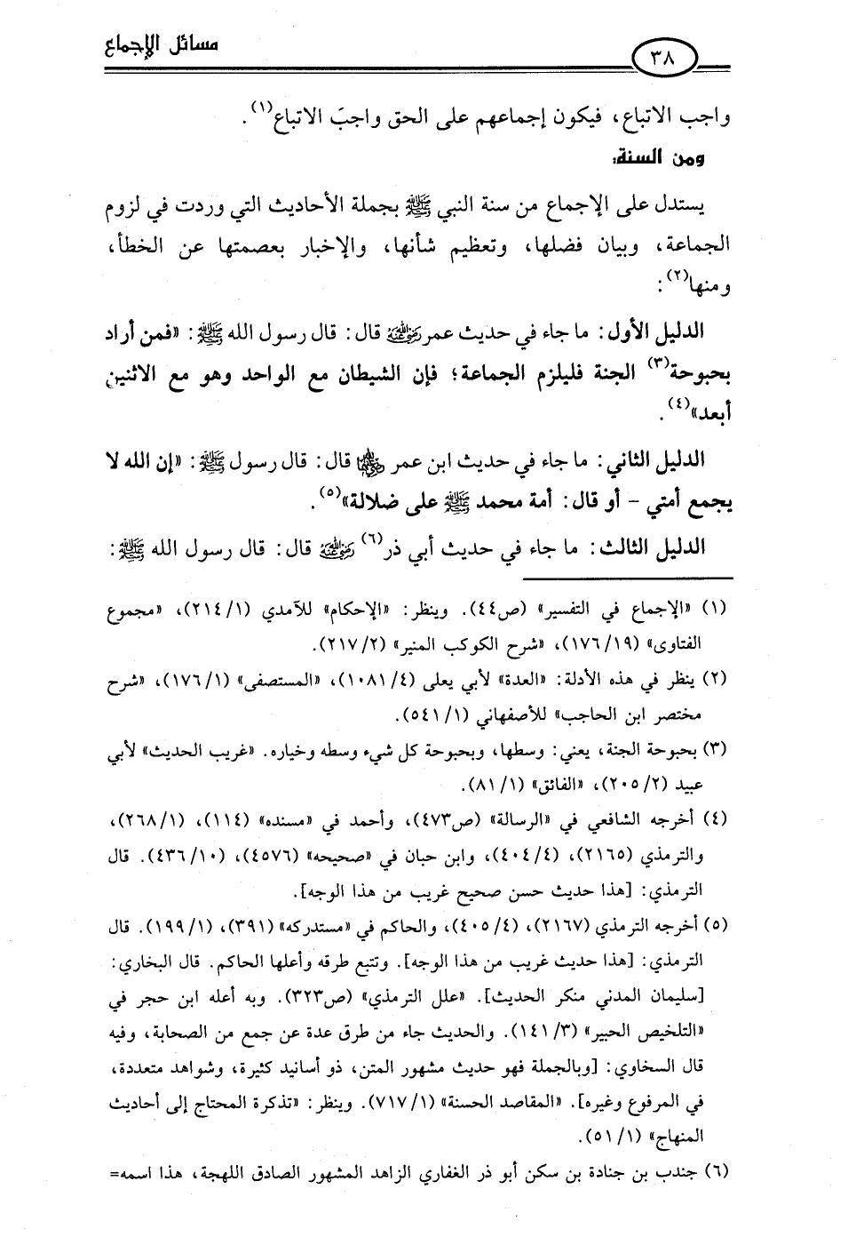 الدليل الأول: ما جاء في حديث عمر -رضي اللَّه عنه- قال: قال رسول اللَّه -صلى اللَّه عليه وسلم-: "فمن أراد بحبوحة (¬3) الجنة فليلزم الجماعة؛ فإن الشيطان مع الواحد وهو مع الاثنين أبعد" (¬4).