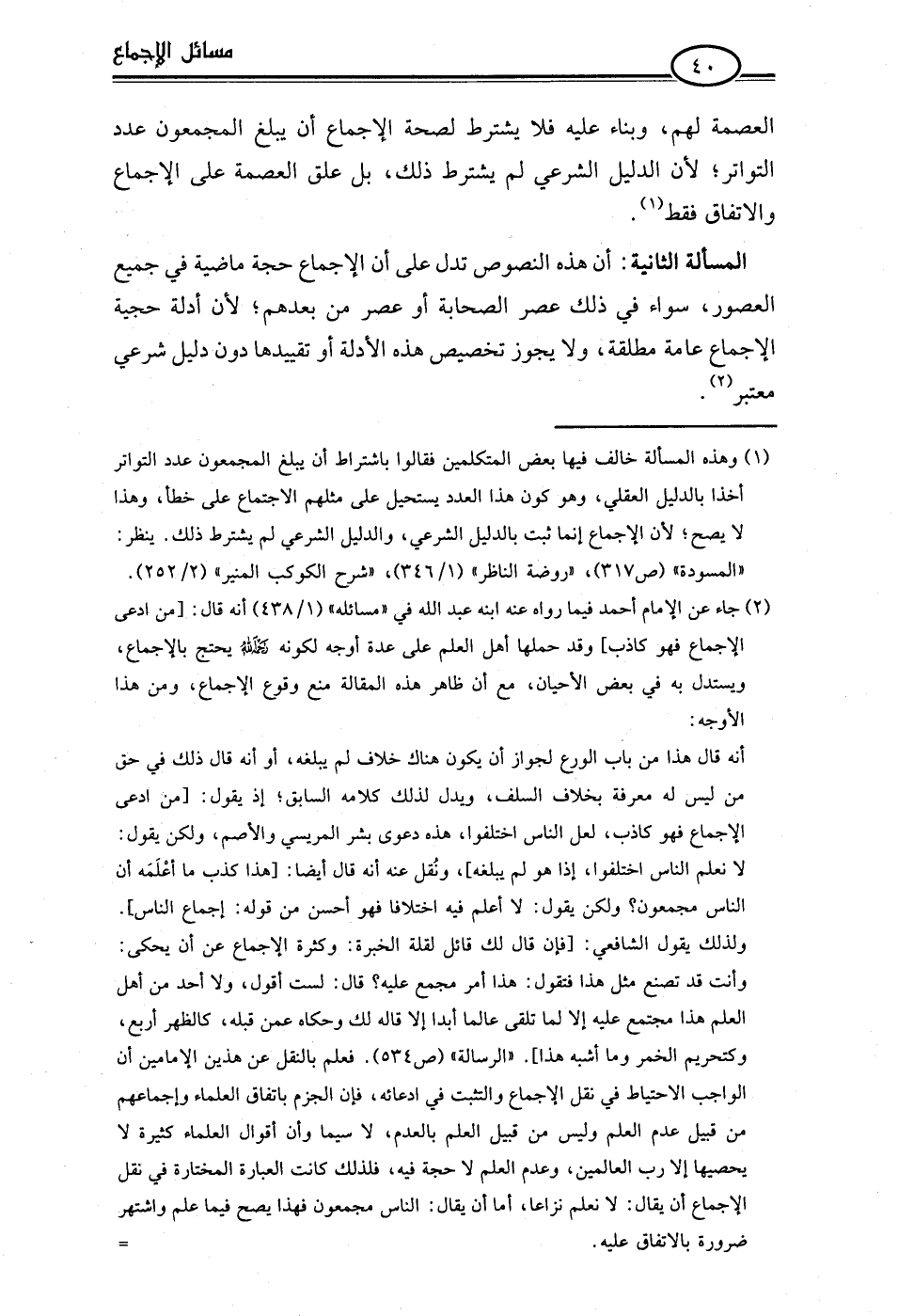 المسألة الثانية: أن هذه النصوص تدل على أن الإجماع حجة ماضية في جميع العصور، سواء في ذلك عصر الصحابة أو عصر من بعدهم؛ لأن أدلة حجية الإجماع عامة مطلقة، ولا يجوز تخصيص هذه الأدلة أو تقييدها دون دليل شرعي معتبر (¬2).