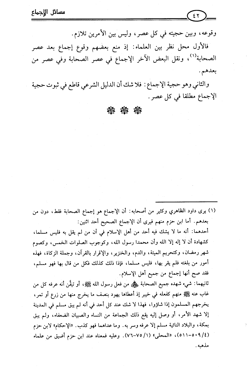 (¬1) يرى داود الظاهري وكثير من أصحابه: أن الإجماع هو إجماع الصحابة فقط، دون من بعدهم. أما ابن حزم منهم فيرى أن الإجماع الصحيح أحد اثنين:
