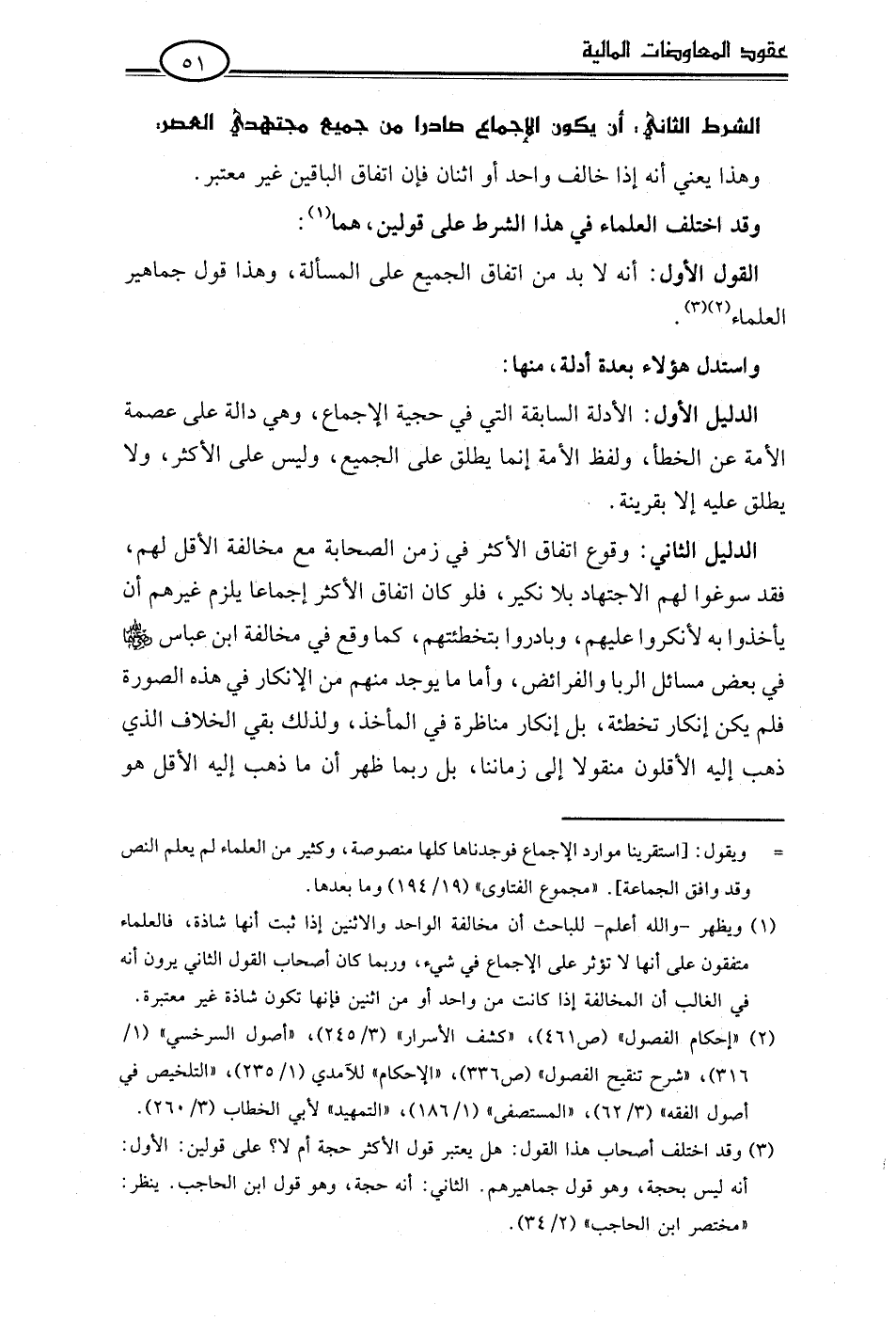 الدليل الثاني: وقوع اتفاق الأكثر في زمن الصحابة مع مخالفة الأقل لهم، فقد سوغوا لهم الاجتهاد بلا نكير، فلو كان اتفاق الأكثر إجماعا يلزم غيرهم أن يأخذوا به لأنكروا عليهم، وبادروا بتخطئتهم، كما وقع في مخالفة ابن عباس -رضي اللَّه عنهما- في بعض مسائل الربا والفرائف، وأما ما يوجد منهم من الإنكار في هذه الصورة فلم يكن إنكار تخطئة، بل إنكار مناظرة في المأخذ، ولذلك بقي الخلاف الذي ذهب إليه الأقلون منقولا إلى زماننا، بل ربما ظهر أن ما ذهب إليه الأقل هو