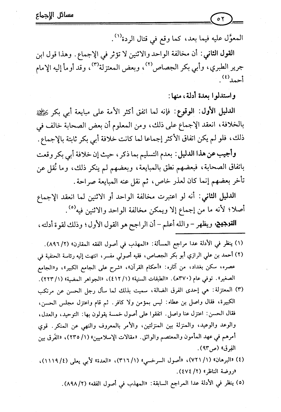 القول الثاني: أن مخالفة الواحد والاثنين لا تؤثر في الإجماع. وهذا قول ابن جرير الطبري، وأبي بكر الجصاص (¬2)، وبعض المعتزلة (¬3)، وقد أومأ إليه الإمام أحمد (¬4).