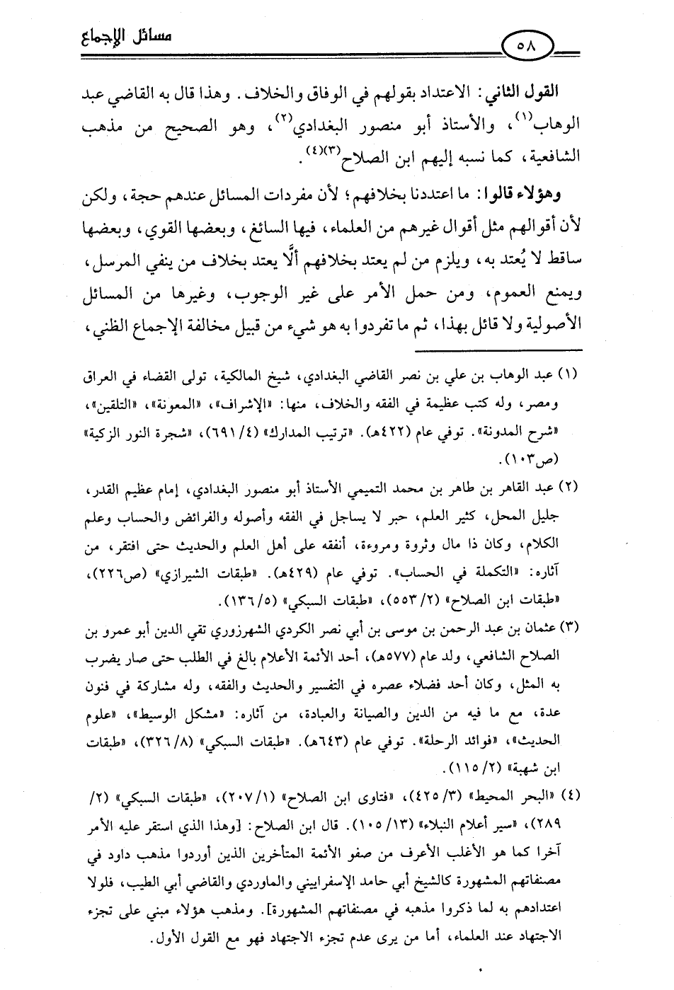 (¬4) "البحر المحيط" (3/ 425)، "فتاوى ابن الصلاح" (1/ 207)، "طبقات السبكي" (2/ 289)، "سير أعلام النبلاء" (13/ 105). قال ابن الصلاح: [وهذا الذي استقر عليه الأمر آخرا كما هو الأغلب الأعرف من صفو الأئمة المتأخرين الذين أوردوا مذهب داود في مصنفاتهم المشهورة كالشيخ أبي حامد الإسفراييني والماوردي والقاضي أبي الطيب، فلولا اعتدادهم به لما ذكروا مذهبه في مصنفاتهم المشهورة]. ومذهب هؤلاء مبني على تجزء الاجتهاد عند العلماء، أما من يرى عدم تجزء الاجتهاد فهو مع القول الأول.