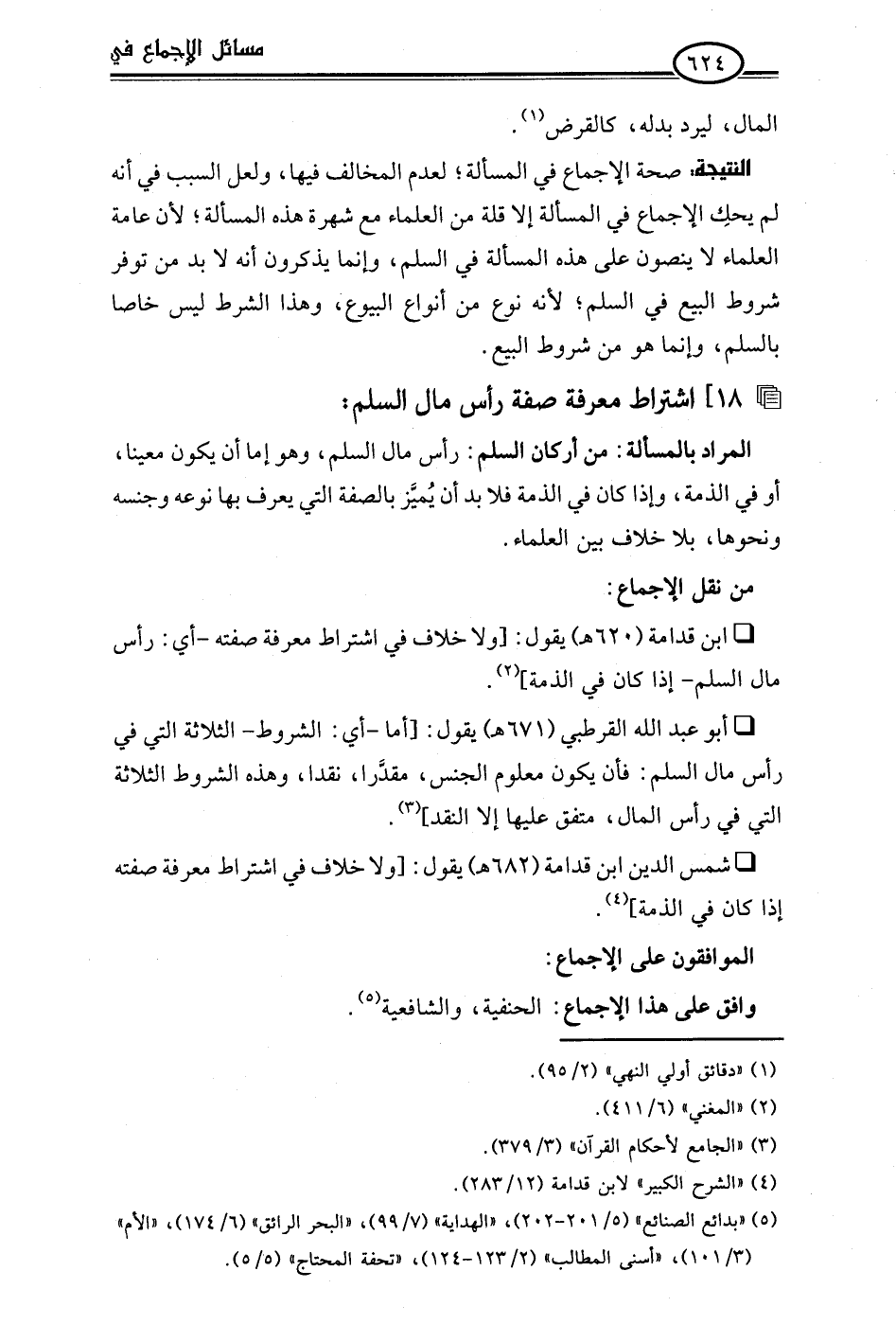 • ابن قدامة (620 هـ) يقول: [ولا خلاف في اشتراط معرفة صفته -أي: رأس مال السلم- إذا كان في الذمة] (¬2).