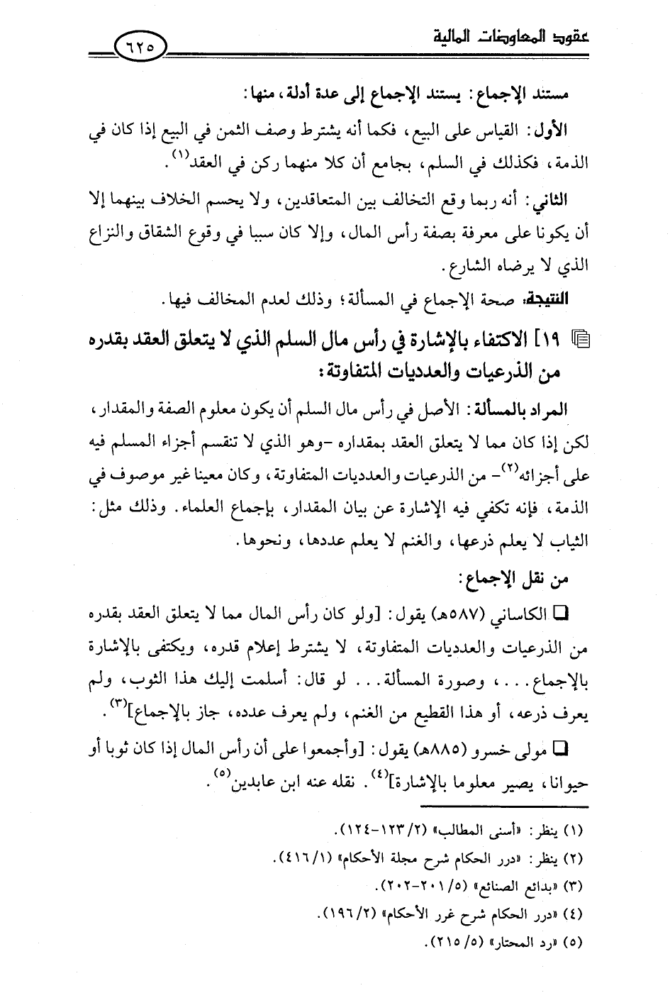 19] الاكتفاء بالإشارة في رأس مال السلم الذي لا يتعلق العقد بقدره من الذرعيات والعدديات المتفاوتة: