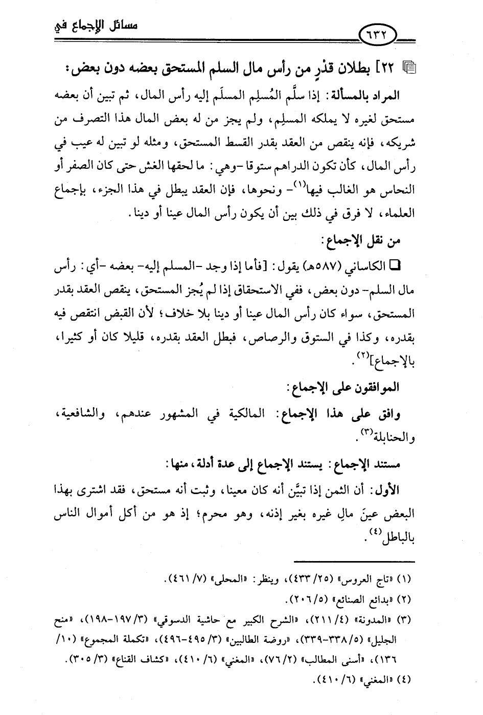 • الكاساني (587 هـ) يقول: [فأما إذا وجد -المسلم إليه- بعضه -أي: رأس مال السلم- دون بعض، ففي الاستحقاق إذا لم يُجز المستحق، ينقص العقد بقدر المستحق، سواء كان رأس المال عينا أو دينا بلا خلاف؛ لأن القبض انتقص فيه بقدره، وكذا في الستوق والرصاص، فبطل العقد بقدره، قليلا كان أو كثيرا، بالإجماع] (¬2).