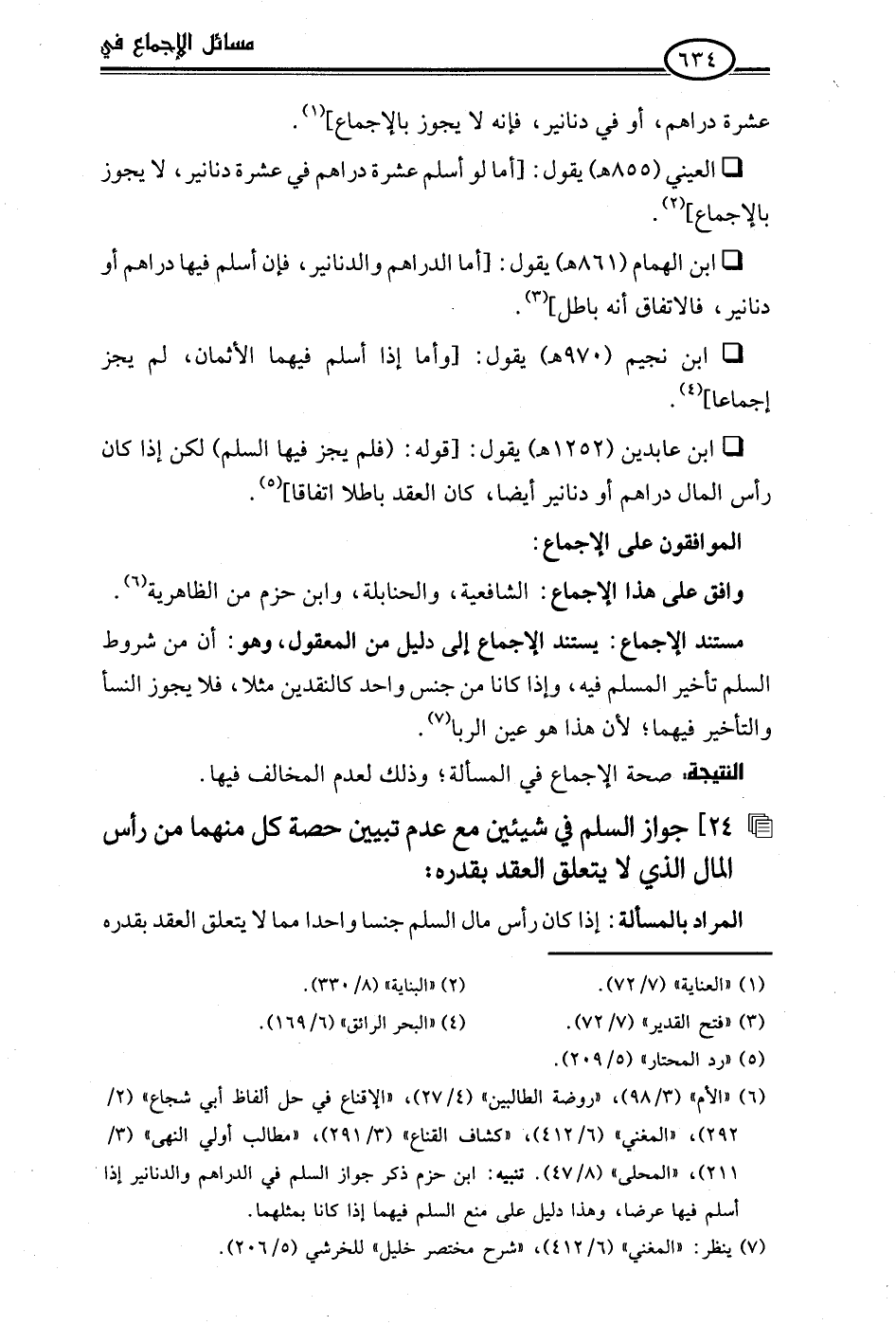 • ابن الهمام (861 هـ) يقول: [أما الدراهم والدنانير، فإن أسلم فيها دراهم أو دنانير، فالاتفاق أنه باطل] (¬3).