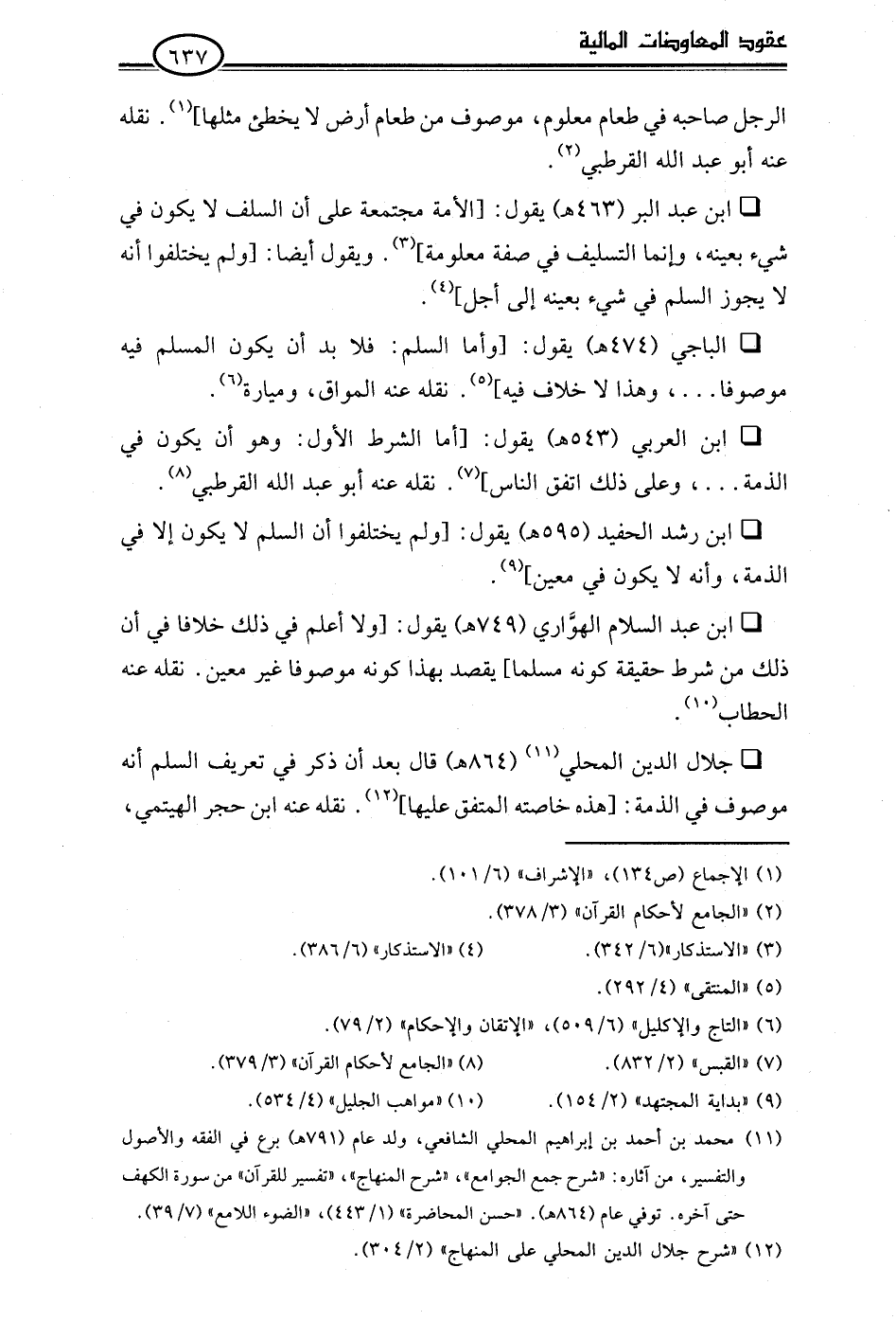 • ابن عبد البر (463 هـ) يقول: [الأمة مجتمعة على أن السلف لا يكون في شيء بعينه، وإنما التسليف في صفة معلومة] (¬3). ويقول أيضا: [ولم يختلفوا أنه لا يجوز السلم في شيء بعينه إلى أجل] (¬4).