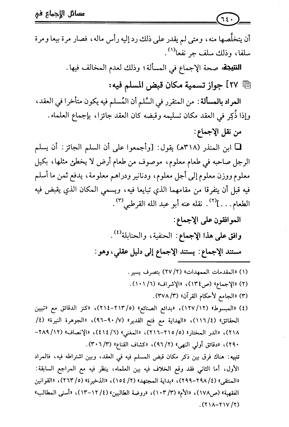 • ابن المنذر (318 هـ) يقول: [وأجمعوا على أن السلم الجائز: أن يسلم الرجل صاحبه في طعام معلوم، موصوف من طعام أرض لا يخطئ مثلها، بكيل معلوم ووزن معلوم إلى أجل معلوم، ودنانير ودراهم معلومة، يدفع ثمن ما أسلم فيه قبل أن يتفرقا من مقامهما الذي تبايعا فيه، ويسمي المكان الذي يقبض فيه الطعام. . .] (¬2). نقله عنه أبو عبد اللَّه القرطبي (¬3).