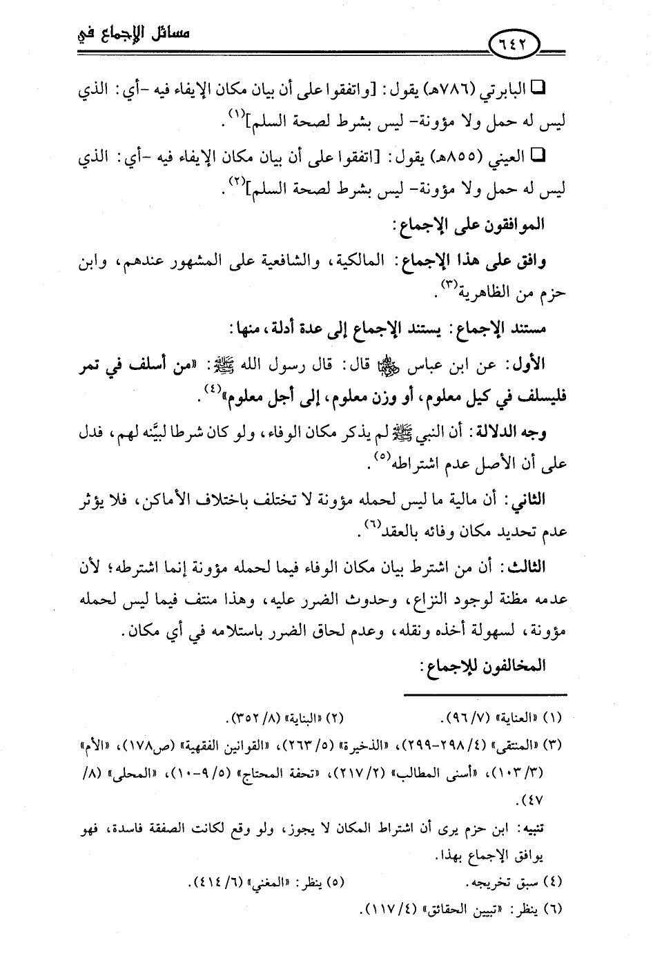 • العيني (855 هـ) يقول: [اتفقوا على أن بيان مكان الإيفاء فيه -أي: الذي ليس له حمل ولا مؤونة- ليس بشرط لصحة السلم] (¬2).