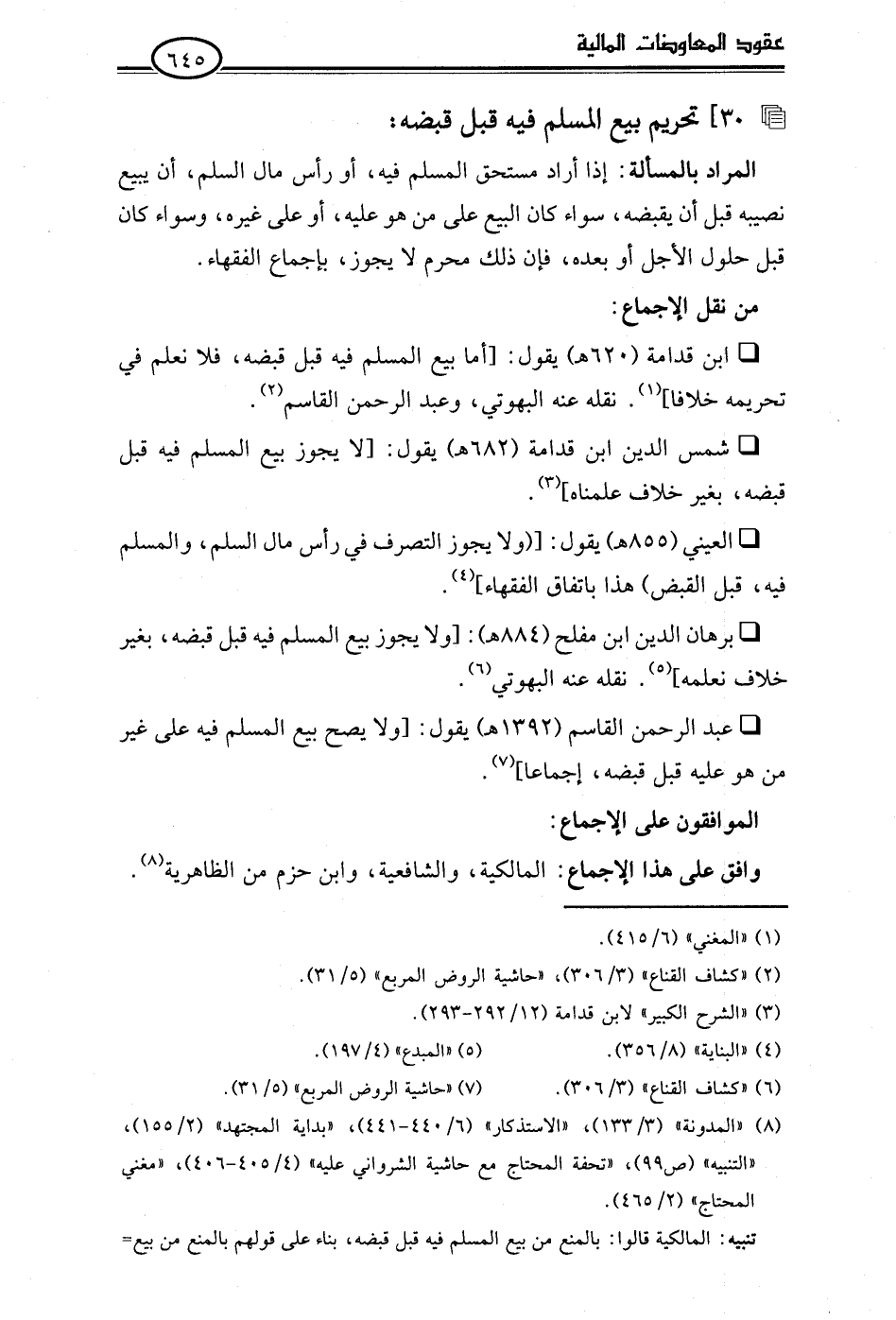 • ابن قدامة (620 هـ) يقول: [أما بيع المسلم فيه قبل قبضه، فلا نعلم في تحريمه خلافا] (¬1). نقله عنه البهوتي، وعبد الرحمن القاسم (¬2).