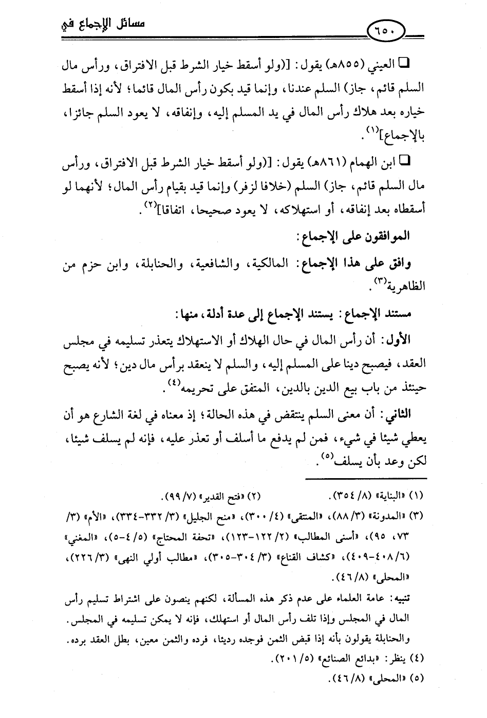 • ابن الهمام (861 هـ) يقول: [(ولو أسقط خيار الشرط قبل الافتراق، ورأس مال السلم قائم، جاز) المسلم (خلافًا لزفر) وإنما قيد بقيام رأس المال؛ لأنهما لو أسقطاه بعد إنفاقه، أو استهلاكه، لا يعود صحيحا، اتفاقا] (¬2).