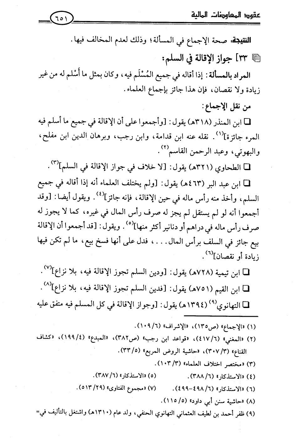 • التهانوي (¬9) (1394 هـ) يقول: [وجواز الإقالة في كل المسلم فيه متفق عليه