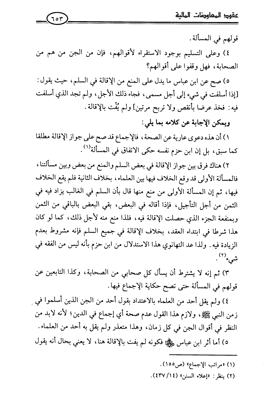 2) هناك فرق بين جواز الإقالة في بعض السلم والمنع من بعض وبين مسألتنا، فالمسألة الأولى قد وقع الخلاف فيها بين العلماء، بخلاف الثانية فلم يقع الخلاف فيها، ثم إن المسألة الأولى من منع منها قال بأن السلم في الغالب يزاد فيه في الثمن من أجل التأجيل، فإذا أقاله في البعض، بقي البعض بالباقي من الثمن وبمنفعة الجزء الذي حصلت الإقالة فيه، فلذا منع منه لأجل ذلك، كما لو كان هذا شرطا في ابتداء العقد، بخلاف الإقالة في جميع السلم فإنه مشروط بعدم الزيادة فيه. ولذا عد التهانوي هذا الاستدلال من ابن حزم بأنه ليس من الفقه في شيء (¬2).