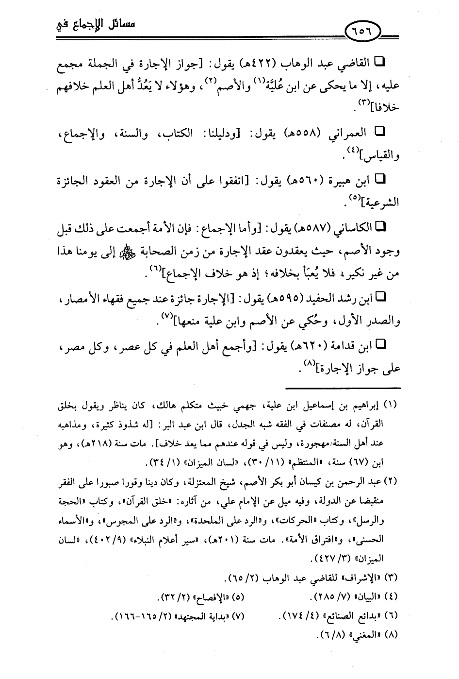 • القاضي عبد الوهاب (422 هـ) يقول: [جواز الإجارة في الجملة مجمع عليه، إلا ما يحكى عن ابن عُليَّة (¬1) والأصم (¬2)، وهؤلاء لا يَعُدُّ أهل العلم خلافهم خلافًا] (¬3).