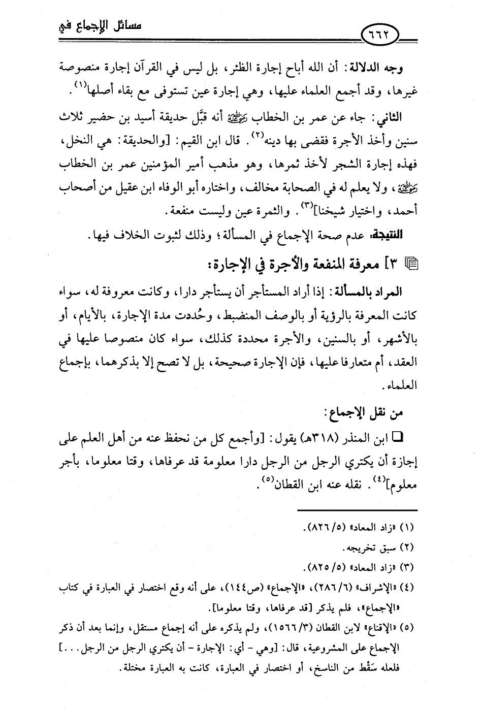 (¬5) "الإقناع" لابن القطان (3/ 1566)، ولم يذكره على أنه إجماع مستقل، وإنما بعد أن ذكر الإجماع على المشروعية، قال: [وهي -أي: الإجارة - أن يكتري الرجل من الرجل. . .] فلعله سَقْط من الناسخ، أو اختصار في العبارة، كانت به العبارة مختلة.