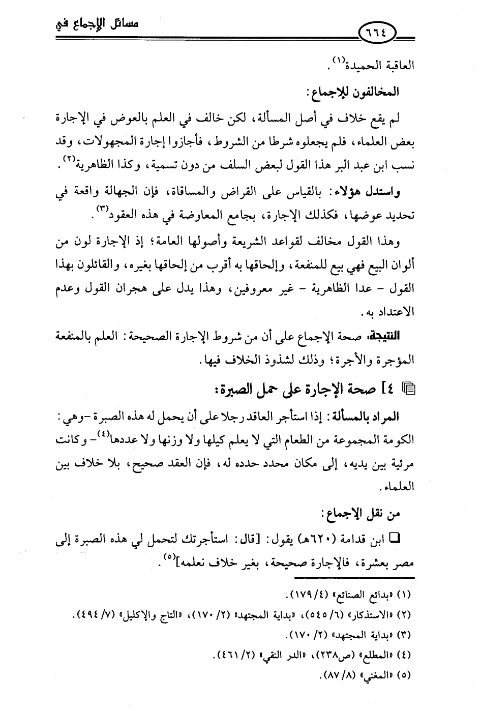 • ابن قدامة (620 هـ) يقول: [قال: استأجرتك لتحمل لي هذه الصبرة إلى مصر بعشرة، فالإجارة صحيحة، بغير خلاف نعلمه] (¬5).