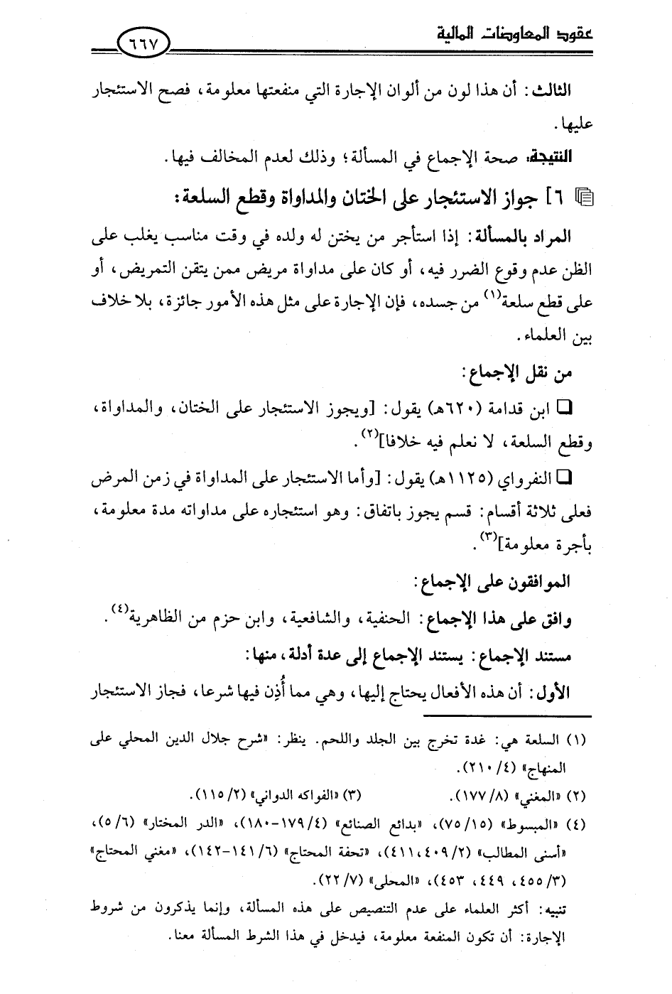 • ابن قدامة (620 هـ) يقول: [ويجوز الاستئجار على الختان، والمداواة، وقطع السلعة، لا نعلم فيه خلافًا] (¬2).