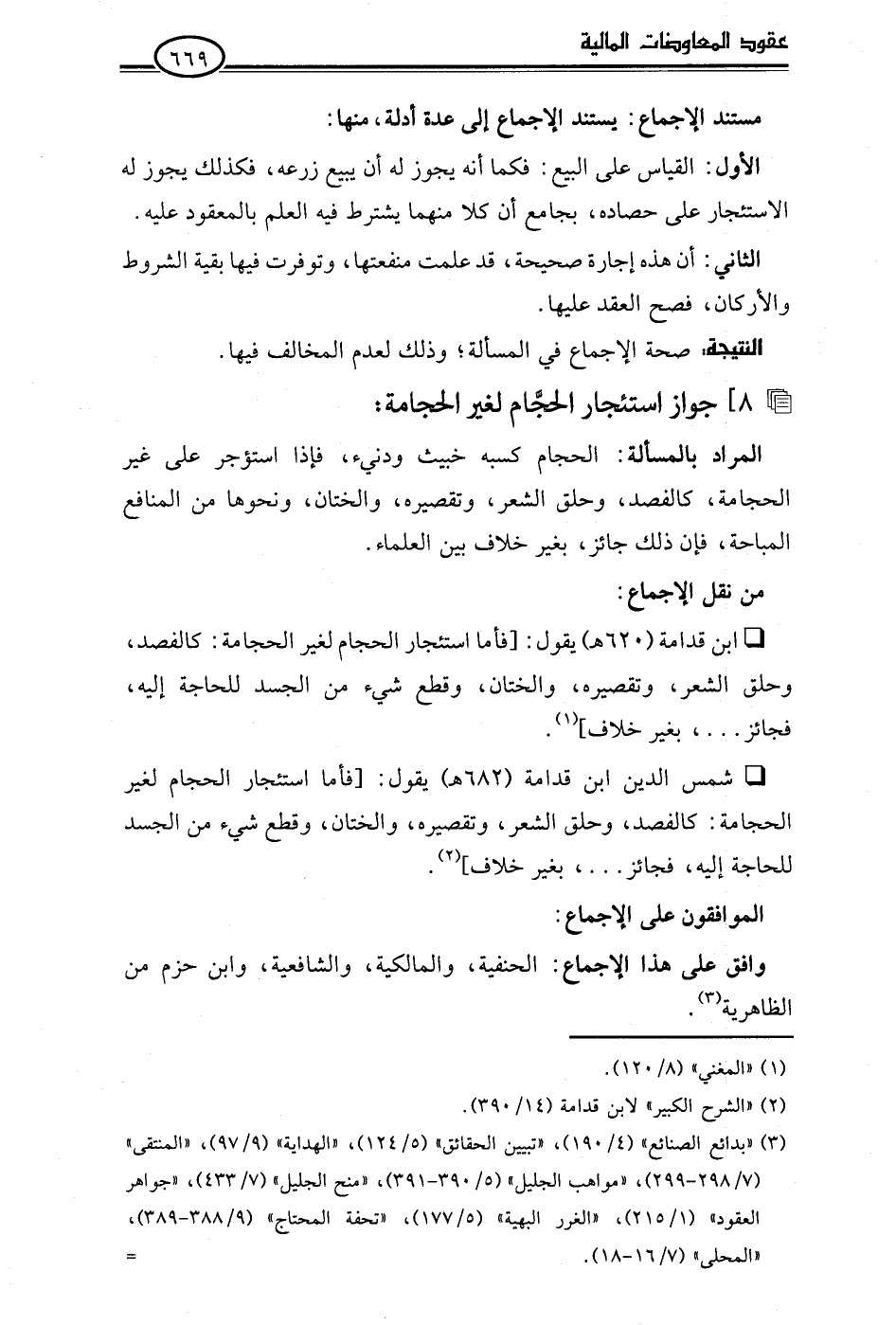 • ابن قدامة (620 هـ) يقول: [فأما استئجار الحجام لغير الحجامة: كالفصد، وحلق الشعر، وتقصيره، والختان، وقطع شيء من الجسد للحاجة إليه، فجائز. . .، بغير خلاف] (¬1).