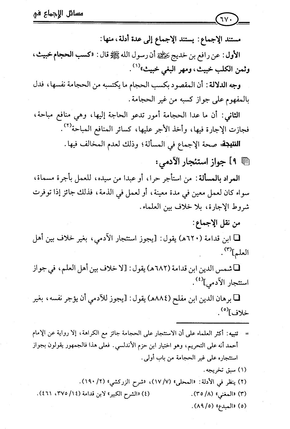 • ابن قدامة (620 هـ) يقول: [يجوز استئجار الآدمي، بغير خلاف بين أهل العلم] (¬3).