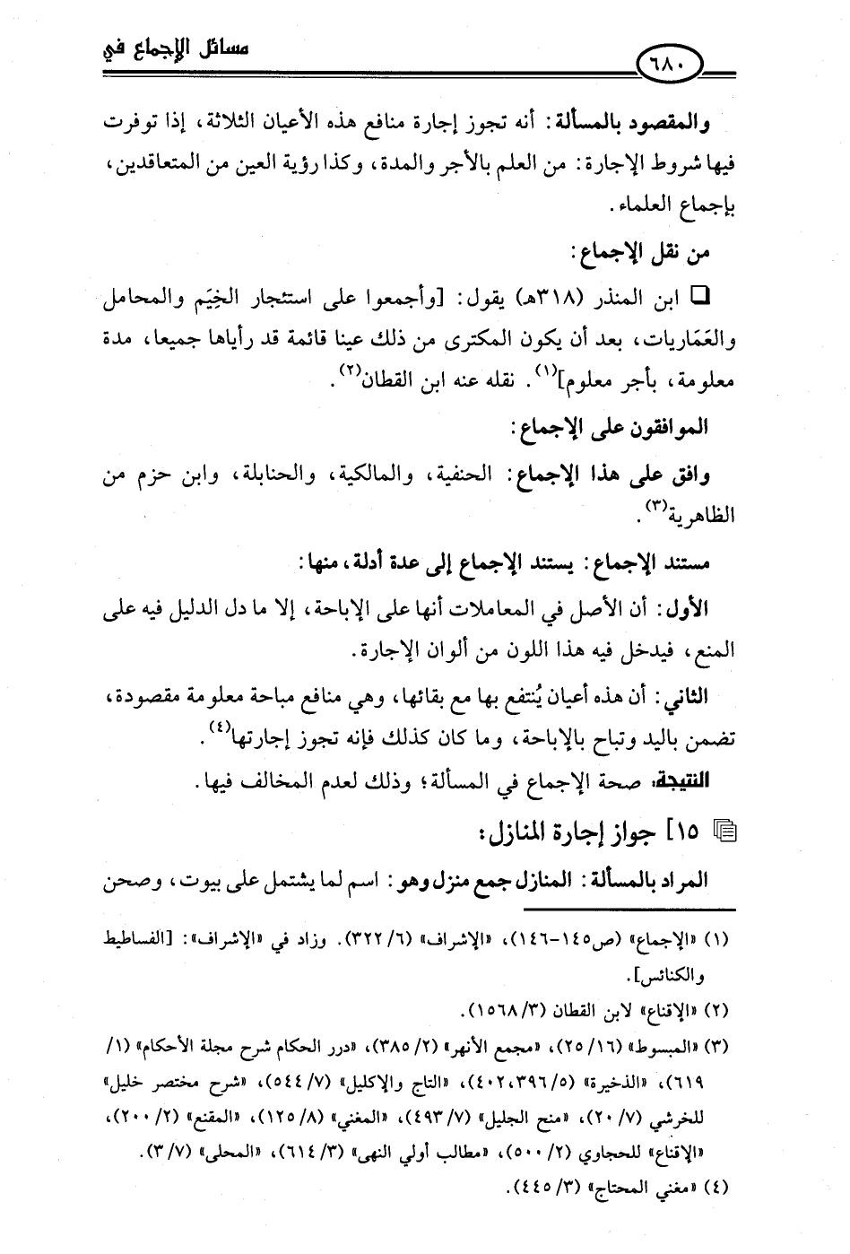 الثاني: أن هذه أعيان يُنتفع بها مع بقائها، وهي منافع مباحة معلومة مقصودة، تضمن باليد وتباح بالإباحة، وما كان كذلك فإنه تجوز إجارتها (¬4).Rصحة الإجماع في المسألة؛ وذلك لعدم المخالف فيها.