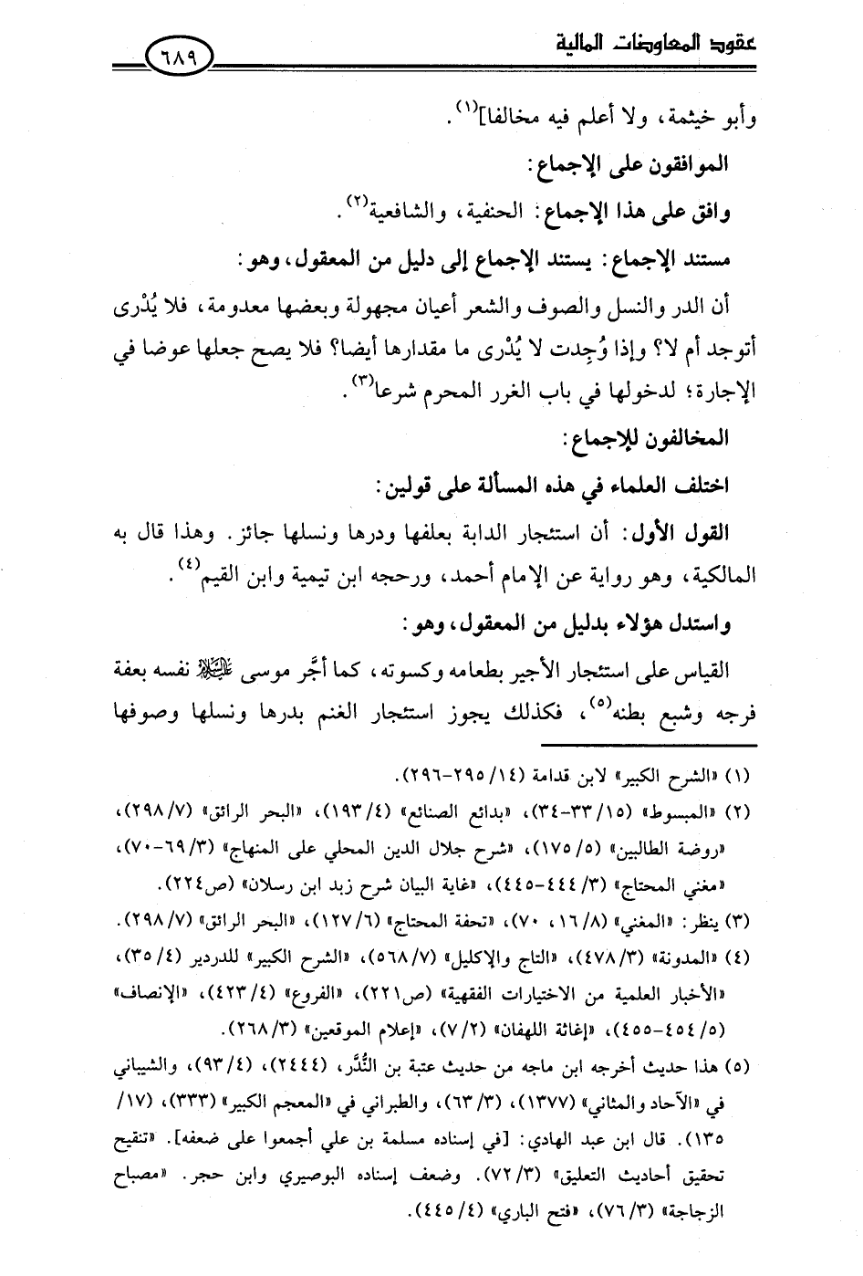 القول الأول: أن استئجار الدابة بعلفها ودرها ونسلها جائز. وهذا قال به المالكية، وهو رواية عن الإمام أحمد، ورجحه ابن تيمية وابن القيم (¬4).