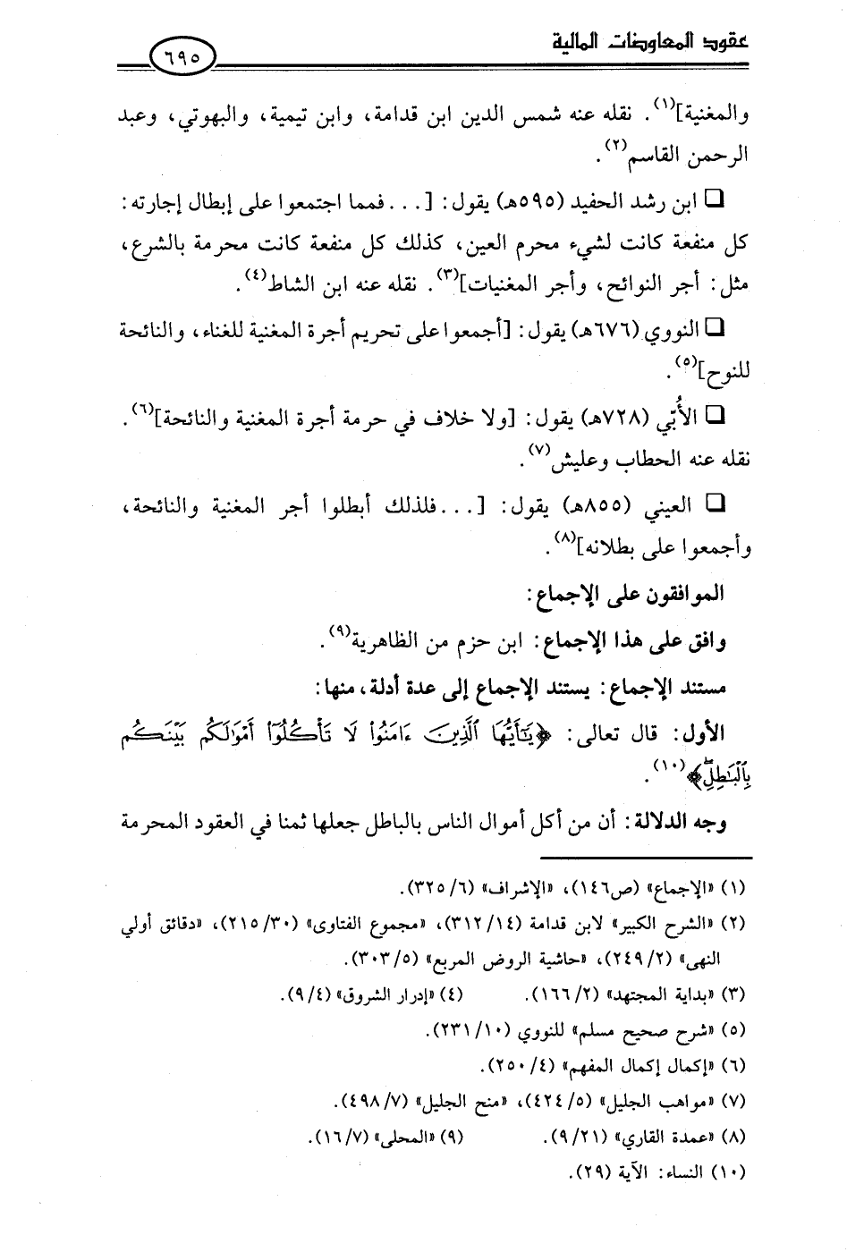 • الأُبّي (728 هـ) يقول: [ولا خلاف في حرمة أجرة المغنية والنائحة] (¬6). نقله عنه الحطاب وعليش (¬7).