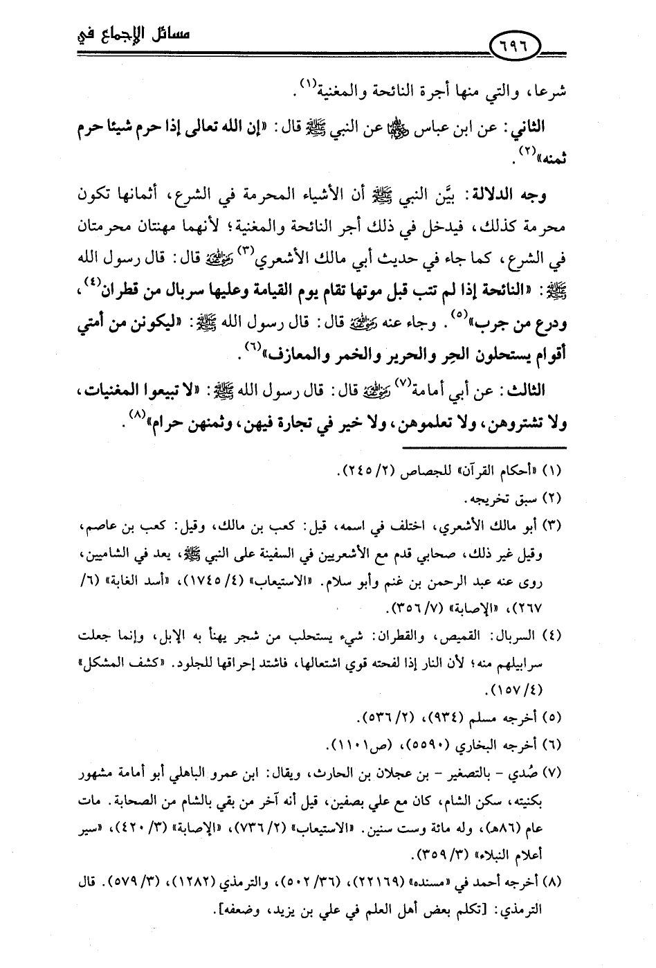 • وجه الدلالة: بيَّن النبي -صلى اللَّه عليه وسلم- أن الأشياء المحرمة في الشرع، أثمانها تكون محرمة كذلك، فيدخل في ذلك أجر النائحة والمغنية؛ لأنهما مهنتان محرمتان في الشرع، كما جاء في حديث أبي مالك الأشعري (¬3) -رضي اللَّه عنه- قال: قال رسول اللَّه -صلى اللَّه عليه وسلم-: "النائحة إذا لم تتب قبل موتها تقام يوم القيامة وعليها سربال من قطران (¬4)، ودرع من جرب" (¬5). وجاء عنه -رضي اللَّه عنه- قال: قال رسول اللَّه -صلى اللَّه عليه وسلم-: "ليكونن من أمتي أقوام يستحلون الحِر والحرير والخمر والمعازف" (¬6).