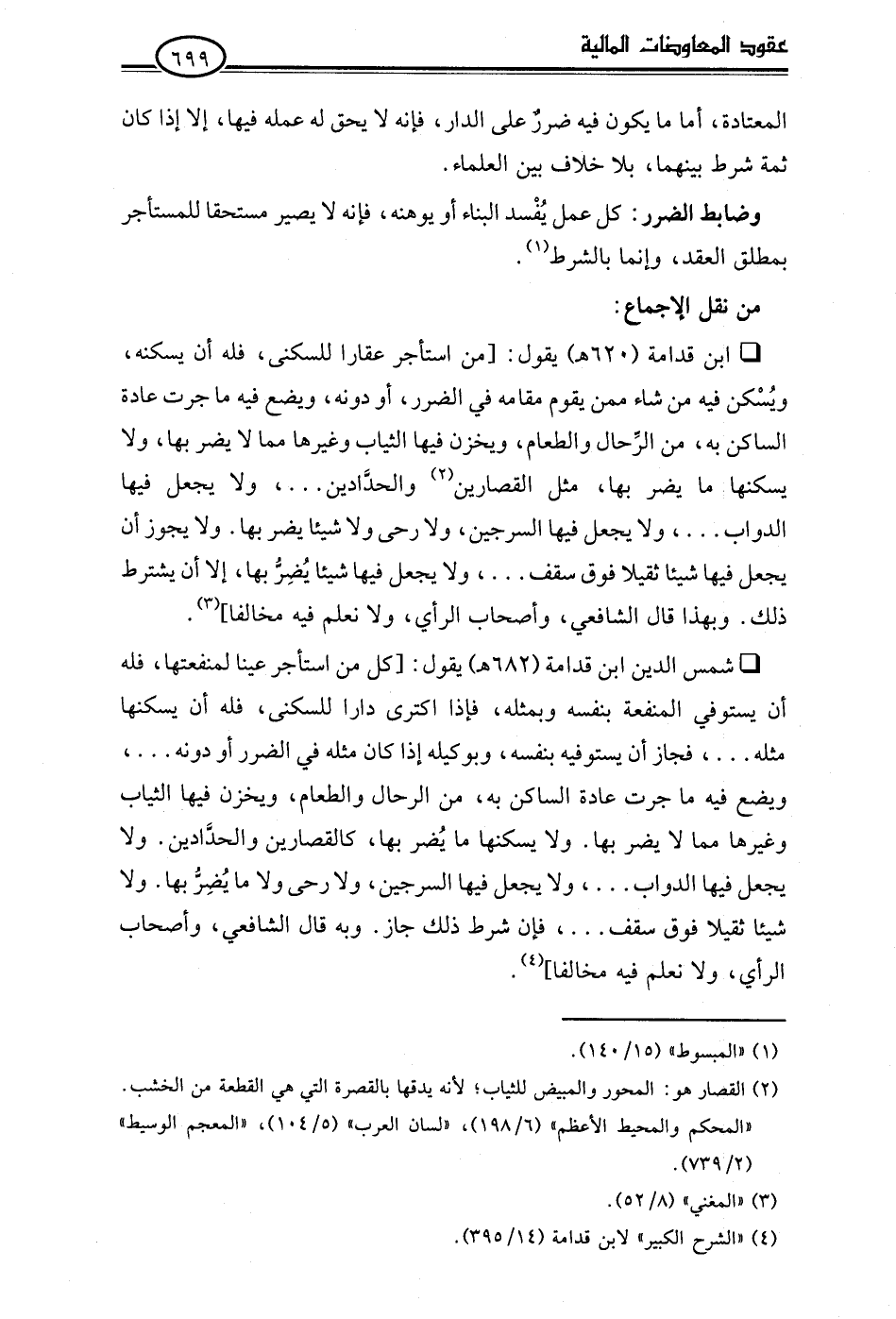 • شمس الدين ابن قدامة (682 هـ) يقول: [كل من استأجر عينا لمنفعتها، فله أن يستوفي المنفعة بنفسه وبمثله، فإذا اكترى دارا للسكنى، فله أن يسكنها مثله. . .، فجاز أن يستوفيه بنفسه، وبوكيله إذا كان مثله في الضرر أو دونه. . .، ويضع فيه ما جرت عادة الساكن به، من الرحال والطعام، ويخزن فيها الثياب وغيرها مما لا يضر بها. ولا يسكنها ما يُضر بها، كالقصارين والحدَّادين. ولا يجعل فيها الدواب. . .، ولا يجعل فيها السرجين، ولا رحى ولا ما يُضِرُّ بها. ولا شيئًا ثقيلا فوق سقف. . .، فإن شرط ذلك جاز. وبه قال الشافعي، وأصحاب الرأي، ولا نعلم فيه مخالفا] (¬4).