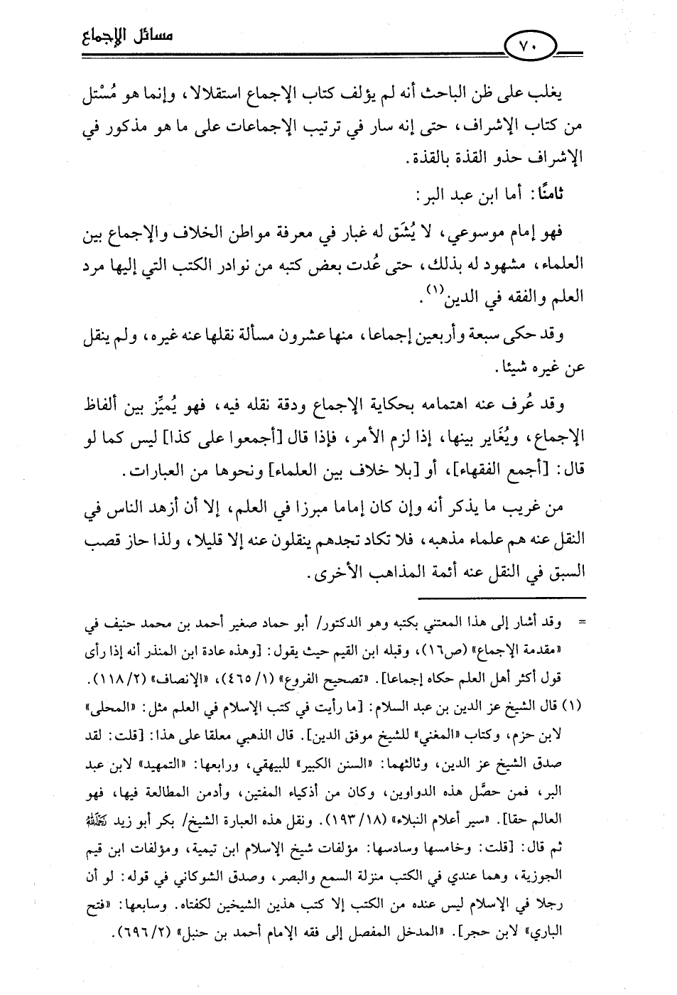 = وقد أشار إلى هذا المعتني بكتبه وهو الدكتور/ أبو حماد صغير أحمد بن محمد حنيف في "مقدمة الإجماع" (ص 16)، وقبله ابن القيم حيث يقول: [وهذه عادة ابن المنذر أنه إذا رأى قول أكثر أهل العلم حكاه إجماعا]. "تصحيح الفروع" (1/ 465)، "الإنصاف" (2/ 118).