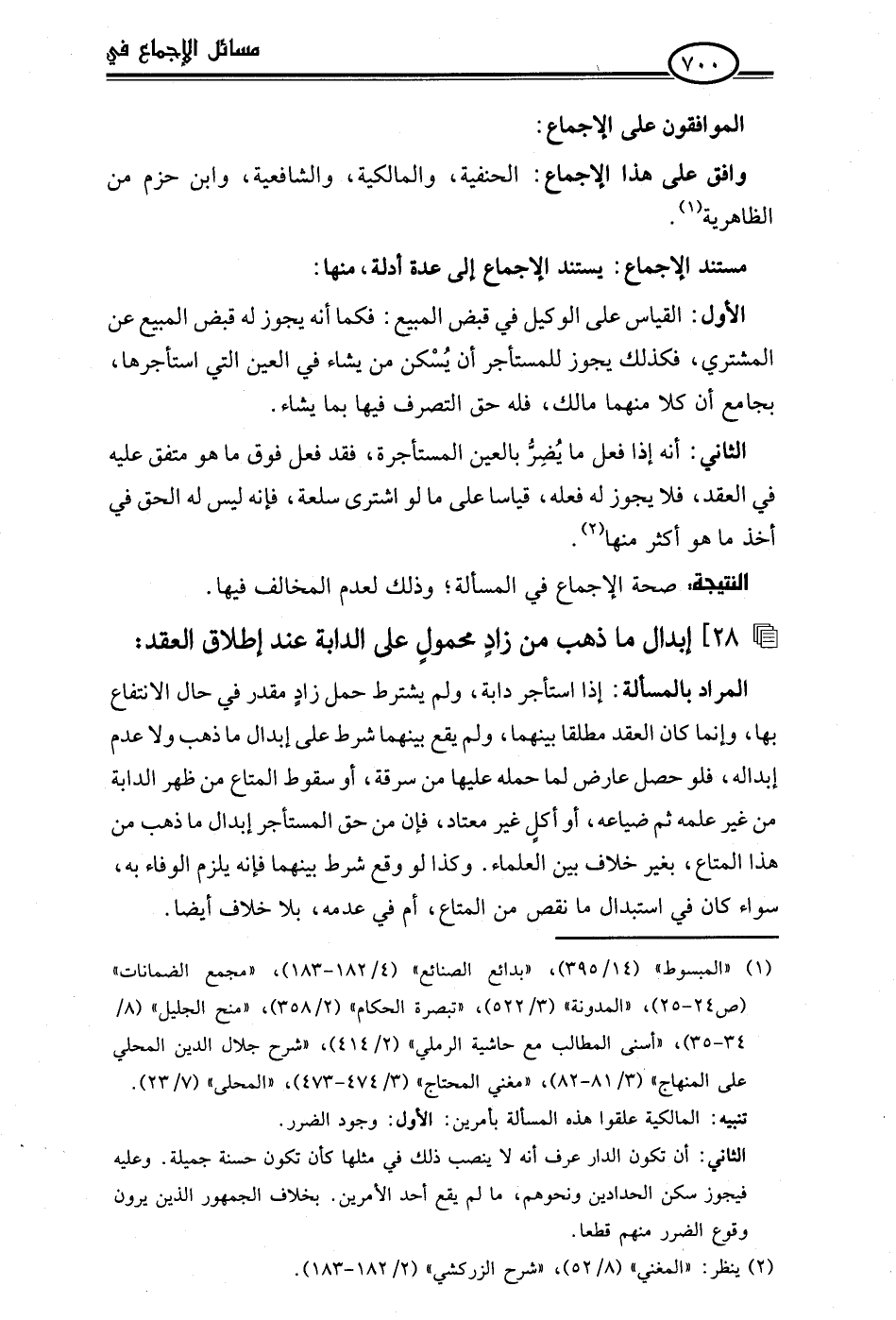 الثاني: أنه إذا فعل ما يُضِرُّ بالعين المستأجرة، فقد فعل فوق ما هو متفق عليه في العقد، فلا يجوز له فعله، قياسا على ما لو اشترى سلعة، فإنه ليس له الحق في أخذ ما هو أكثر منها (¬2).Rصحة الإجماع في المسألة؛ وذلك لعدم المخالف فيها.