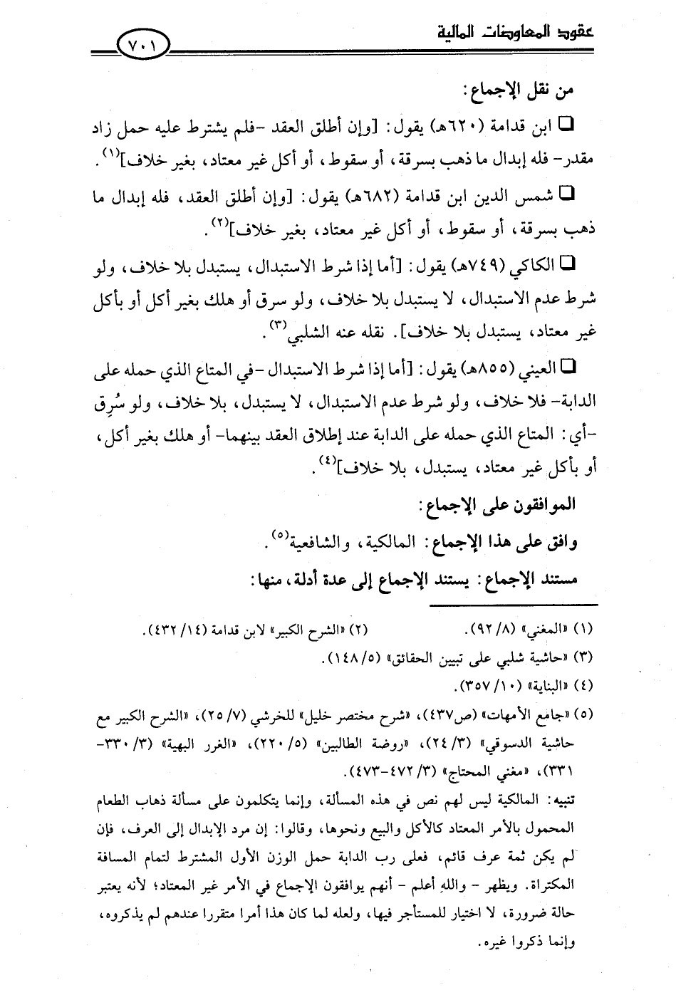 تنبيه: المالكية ليس لهم نص في هذه المسألة، وإنما يتكلمون على مسألة ذهاب الطعام المحمول بالأمر المعتاد كالأكل والبيع ونحوها، وقالوا: إن مرد الإبدال إلى العرف، فإن لم يكن ثمة عرف قائم، فعلى رب الدابة حمل الوزن الأول المشترط لتمام المسافة المكتراة. ويظهر - واللَّهِ أعلم - أنهم يوافقون الإجماع في الأمر غير المعتاد؛ لأنه يعتبر حالة ضرورة، لا اختيار للمستأجر فيها، ولعله لما كان هذا أمرا متقررا عندهم لم يذكروه، وإنما ذكروا غيره.