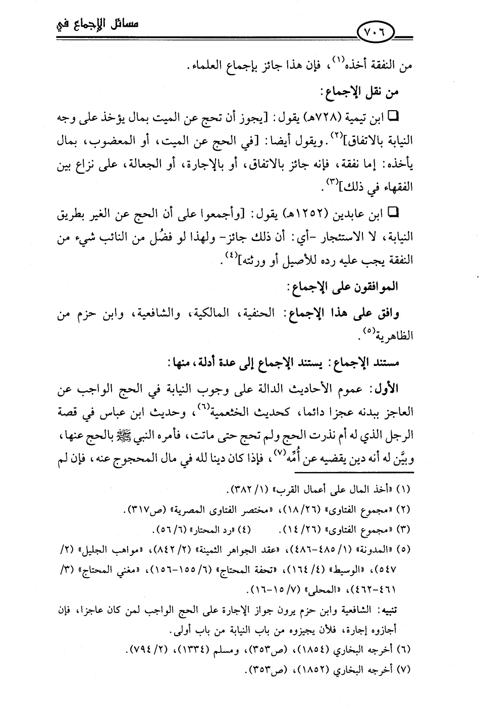• ابن تيمية (728 هـ) يقول: [يجوز أن تحج عن الميت بمال يؤخذ على وجه النيابة بالاتفاق] (¬2). ويقول أيضًا: [في الحج عن الميت، أو المعضوب، بمال يأخذه: إما نفقة، فإنه جائز بالاتفاق، أو بالإجارة، أو الجعالة، على نزاع بين الفقهاء في ذلك] (¬3).