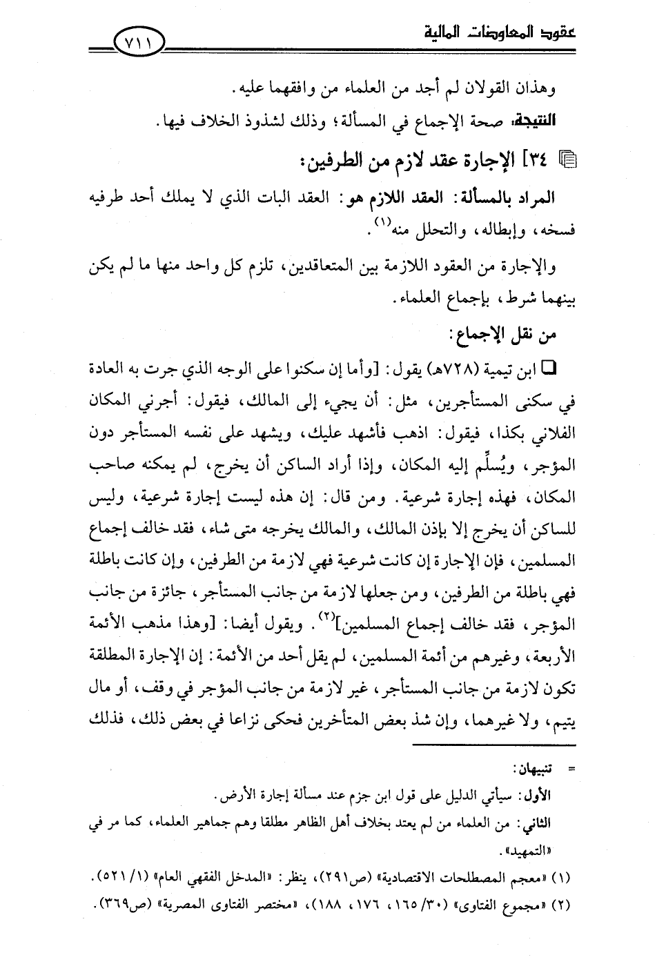 • ابن تيمية (728 هـ) يقول: [وأما إن سكنوا على الوجه الذي جرت به العادة في سكنى المستأجرين، مثل: أن يجيء إلى المالك، فيقول: أجرني المكان الفلاني بكذا، فيقول: اذهب فأشهد عليك، ويشهد على نفسه المستأجر دون المؤجر، ويُسلِّم إليه المكان، وإذا أراد الساكن أن يخرج، لم يمكنه صاحب المكان، فهذه إجارة شرعية. ومن قال: إن هذه ليست إجارة شرعية، وليس للساكن أن يخرج إلا بإذن المالك، والمالك يخرجه متى شاء، فقد خالف إجماع المسلمين، فإن الإجارة إن كانت شرعية فهي لازمة من الطرفين، وإن كانت باطلة فهي باطلة من الطرفين، ومن جعلها لازمة من جانب المستأجر، جائزة من جانب المؤجر، فقد خالف إجماع المسلمين] (¬2). ويقول أيضًا: [وهذا مذهب الأئمة الأربعة، وغيرهم من أئمة المسلمين، لم يقل أحد من الأئمة: إن الإجارة المطلقة تكون لازمة من جانب المستأجر، غير لازمة من جانب المؤجر في وقف، أو مال يتيم، ولا غيرهما، وإن شذ بعض المتأخرين فحكى نزاعا في بعض ذلك، فذلك