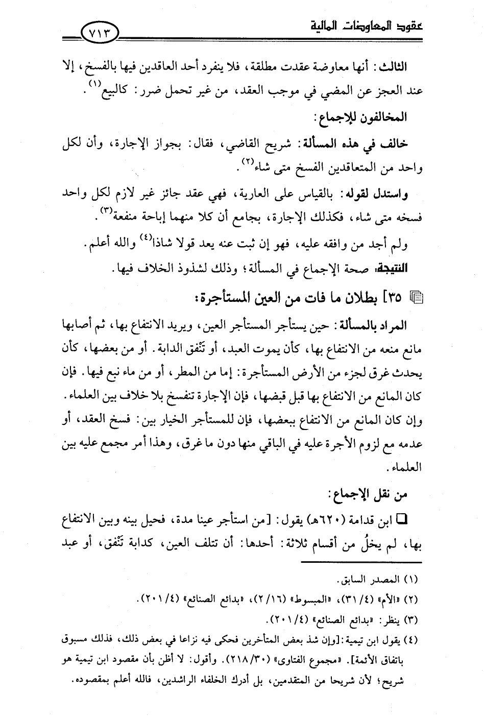 • ابن قدامة (620 هـ) يقول: [من استأجر عينا مدة، فحيل بينه وبين الانتفاع بها، لم يخلُ من أقسام ثلاثة: أحدها: أن تتلف العين، كدابة تَنْفق، أو عبد