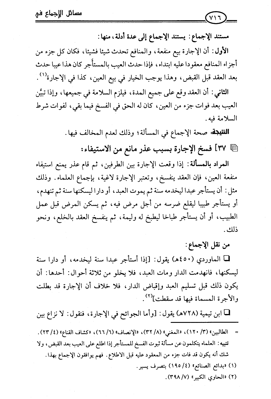 • الماوردي (450 هـ) يقول: [إذا أستأجر عبدا سنة ليخدمه، أو دارا سنة ليسكنها، فانهدمت الدار ومات العبد، فلا يخلو من ثلاثة أحوال: أحدها: أن يكون ذلك قبل تسليم العبد وإقباض الدار، فلا خلاف أن الإجارة قد بطلت والأجرة المسماة فيها قد سقطت] (¬2).