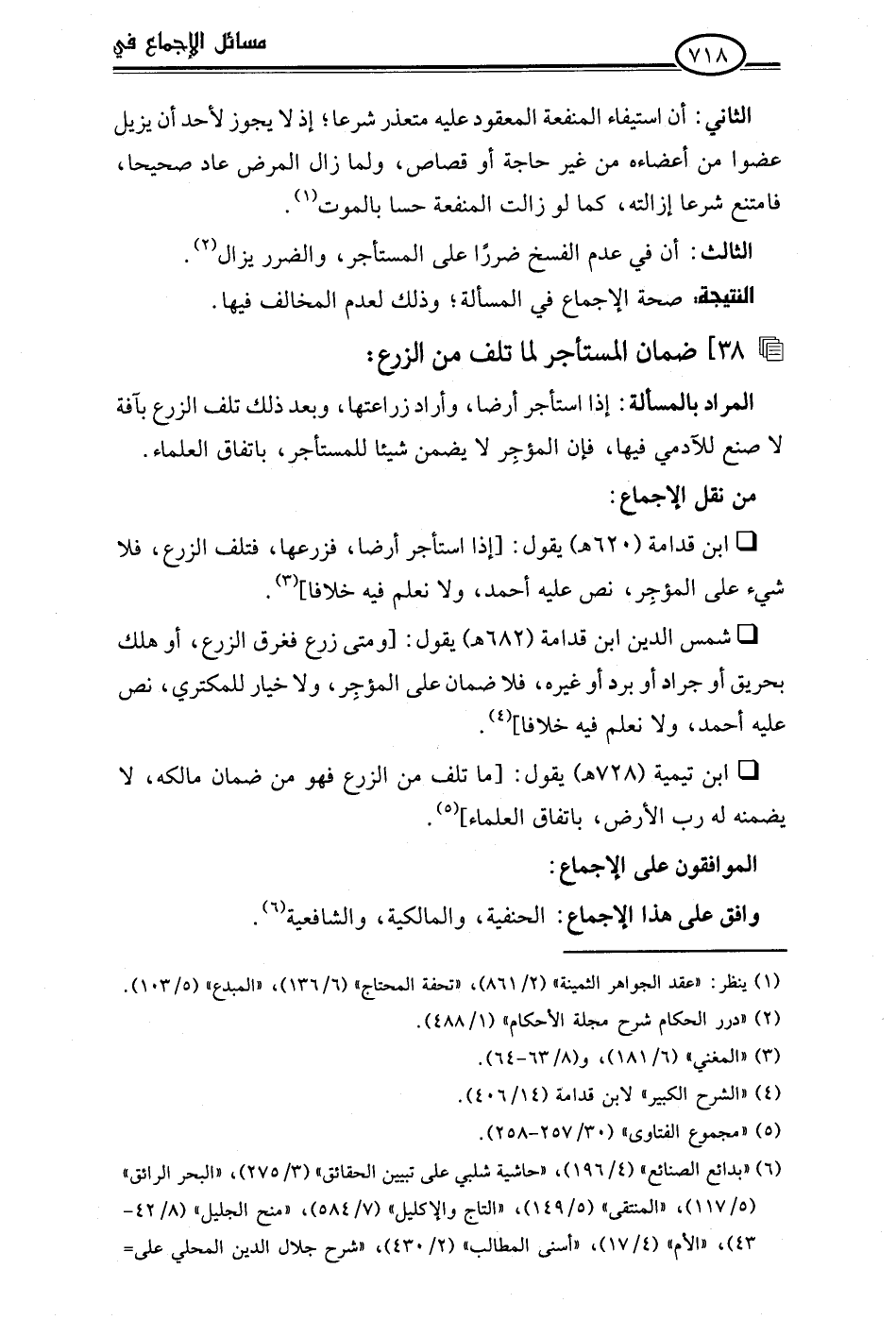 • ابن تيمية (728 هـ) يقول: [ما تلف من الزرع فهو من ضمان مالكه، لا يضمنه له رب الأرض، باتفاق العلماء] (¬5).